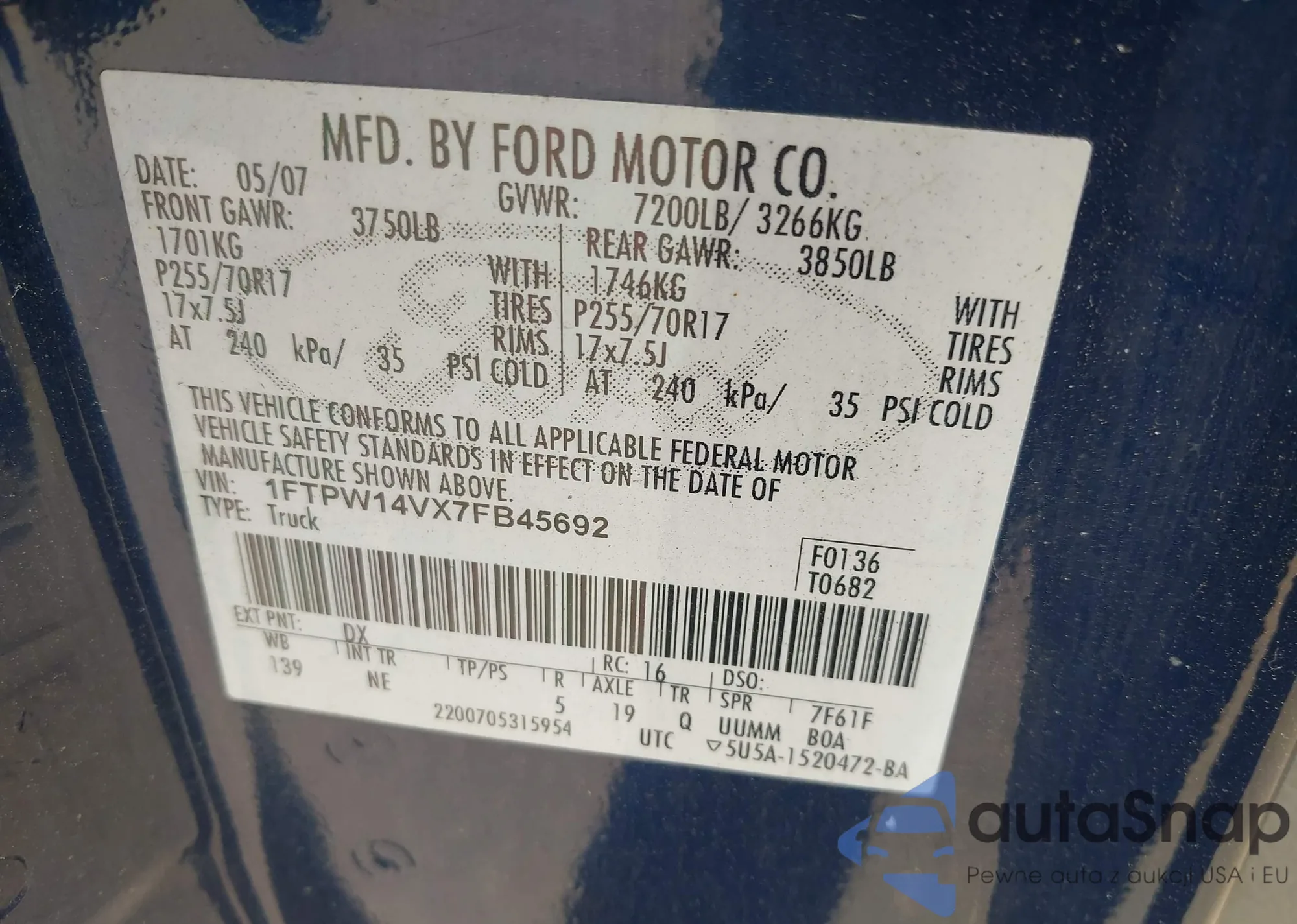 VIN: 1FTPW14VX7FB45692