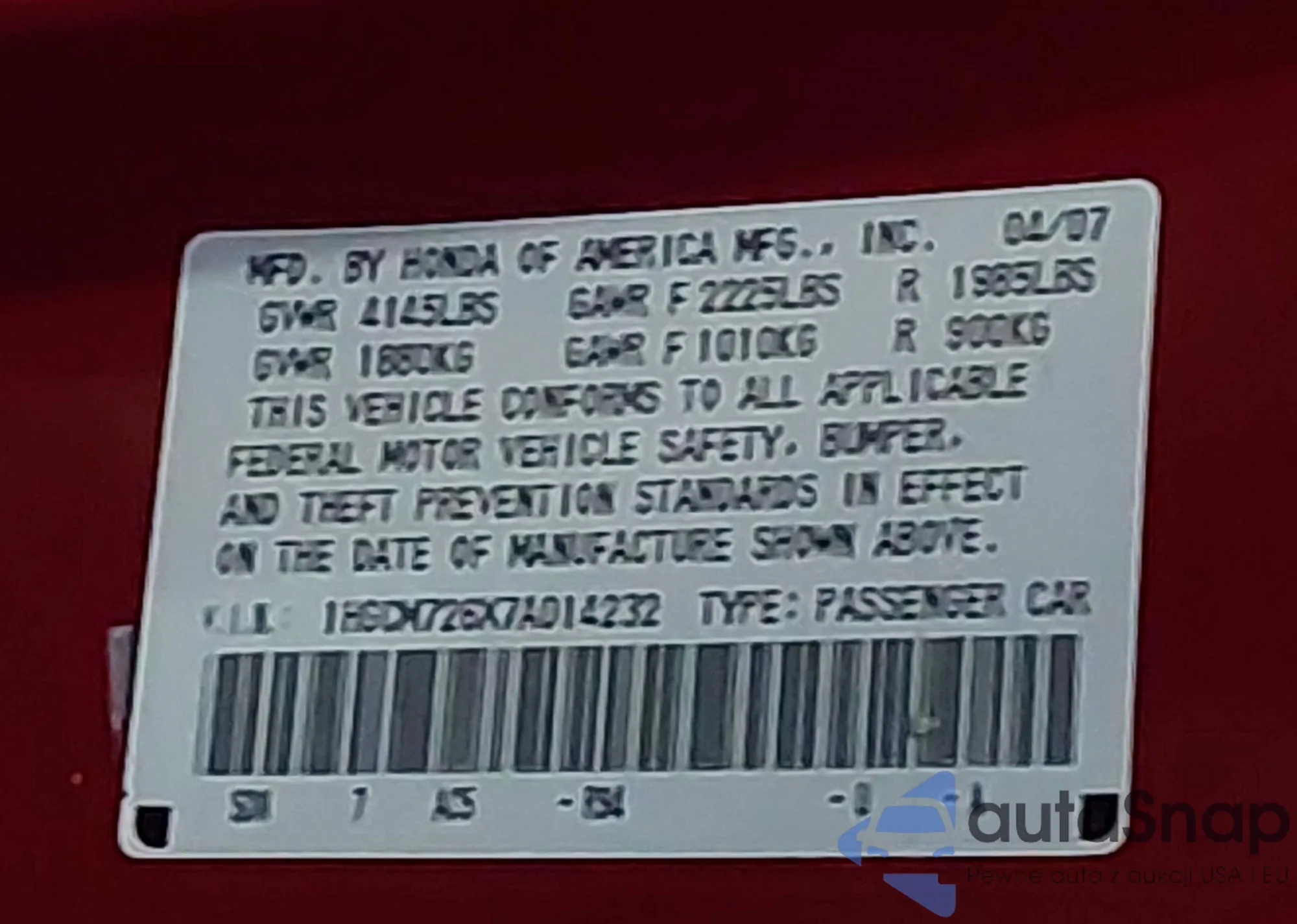 The car Honda Accord 2007 (VIN 1HGCM726X7A014232) has not been auctioned before. The documents are clean, and the mileage matches or is below the market average. Sold by an insurance company – we recommend purchase. Delivery to the port will take approx. 6–8 weeks.