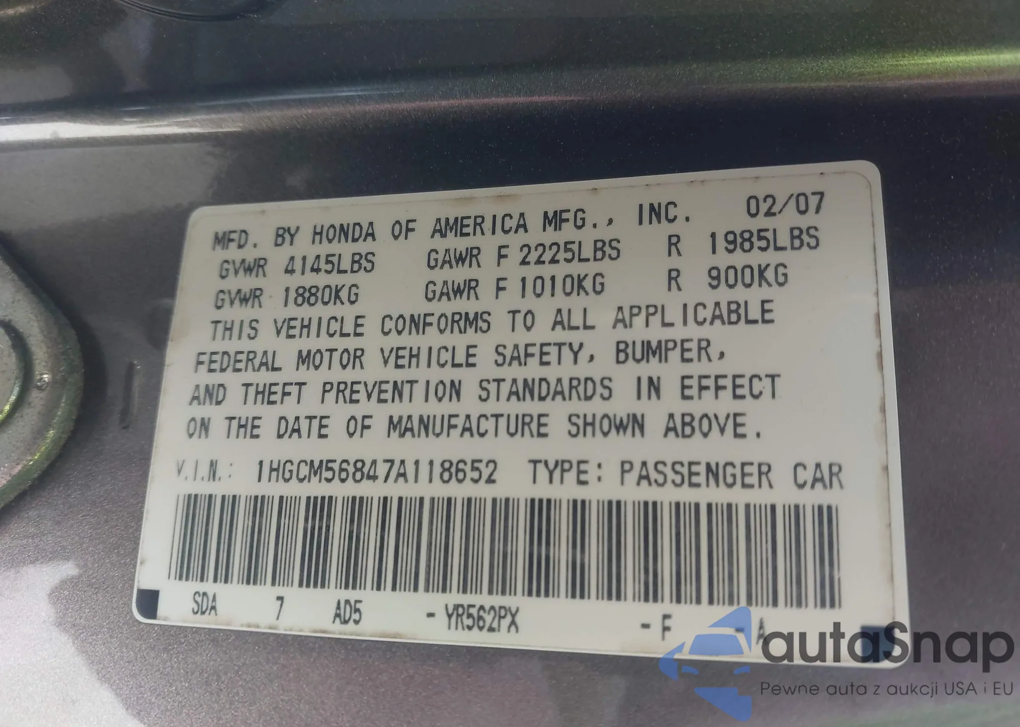 VIN: 1HGCM56847A118652