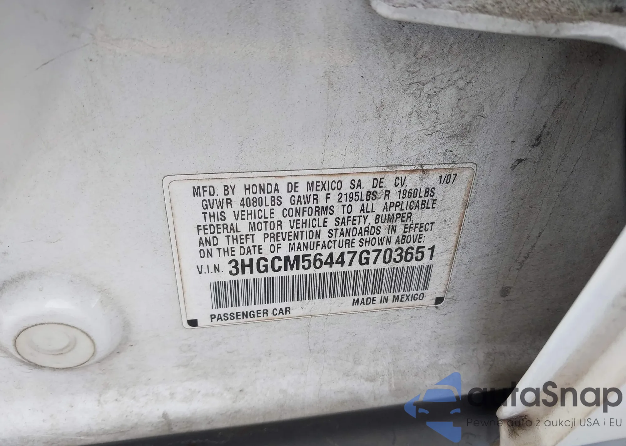 The car Honda Accord 2007 (VIN 3HGCM56447G703651) has not been auctioned before. The documents are clean, and the mileage matches or is below the market average. Sold by an insurance company – we recommend purchase. Delivery to the port will take approx. 6–8 weeks.