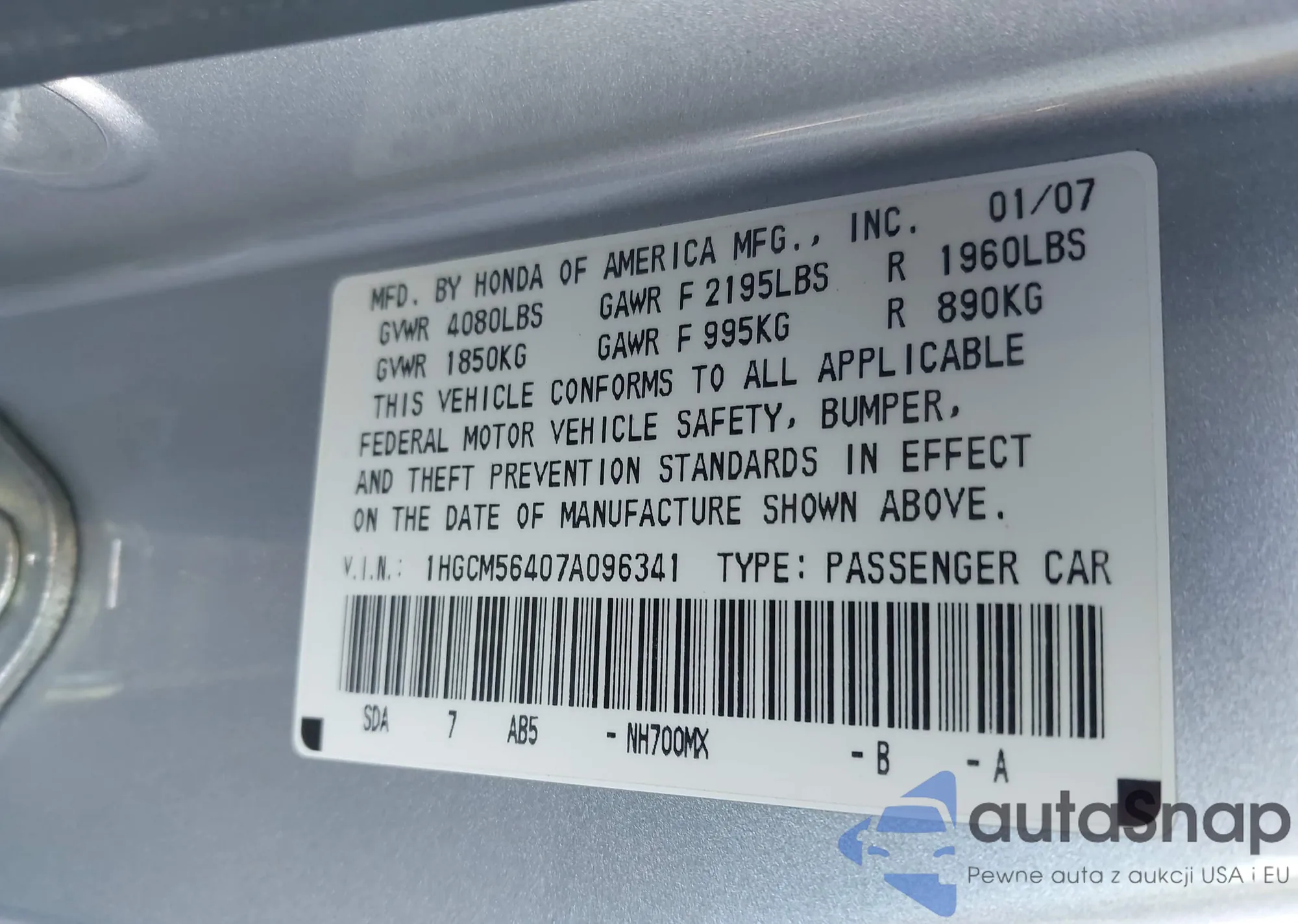 • VIN: 1HGCM56407A096341