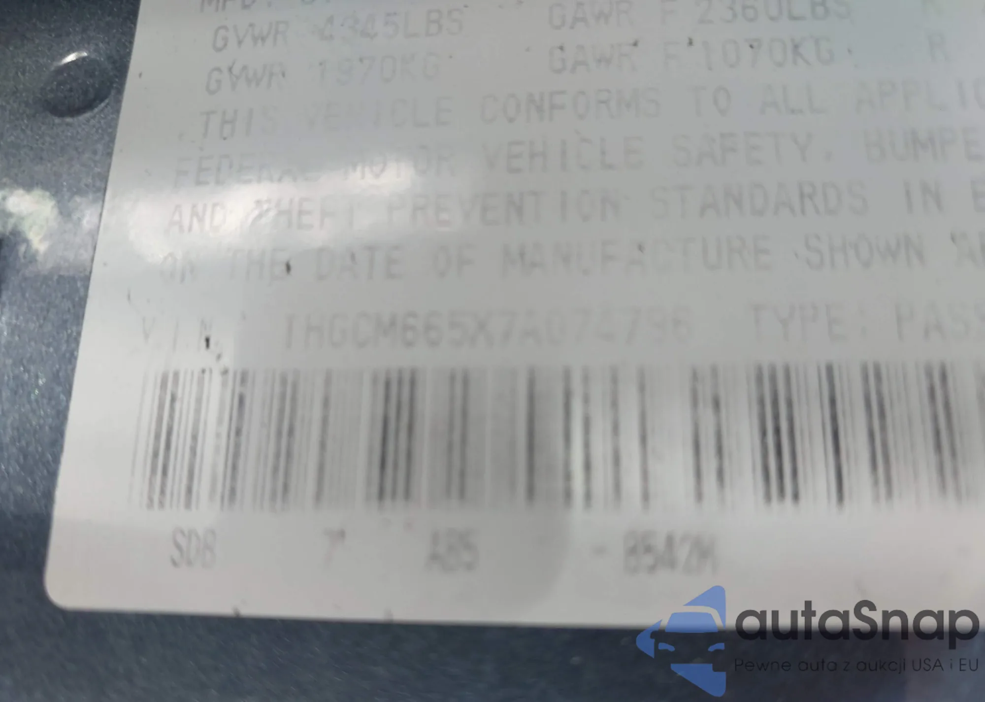 The car Honda Accord 2007 (VIN 1HGCM665X7A074796) has not been auctioned before. The documents are clean, and the mileage matches or is below the market average. Sold by an insurance company – we recommend purchase. Delivery to the port will take approx. 6–8 weeks.