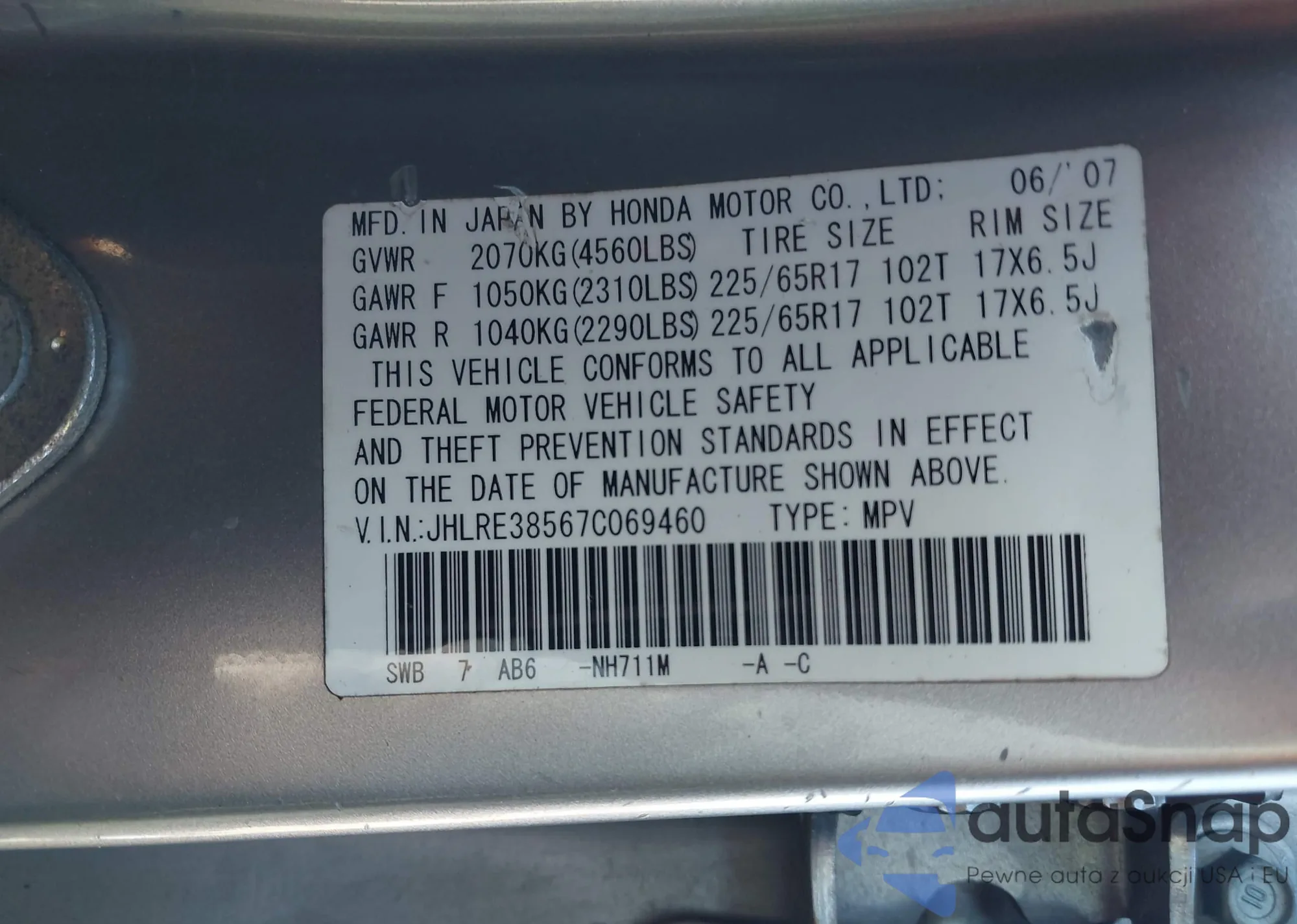 VIN: JHLRE38567C069460