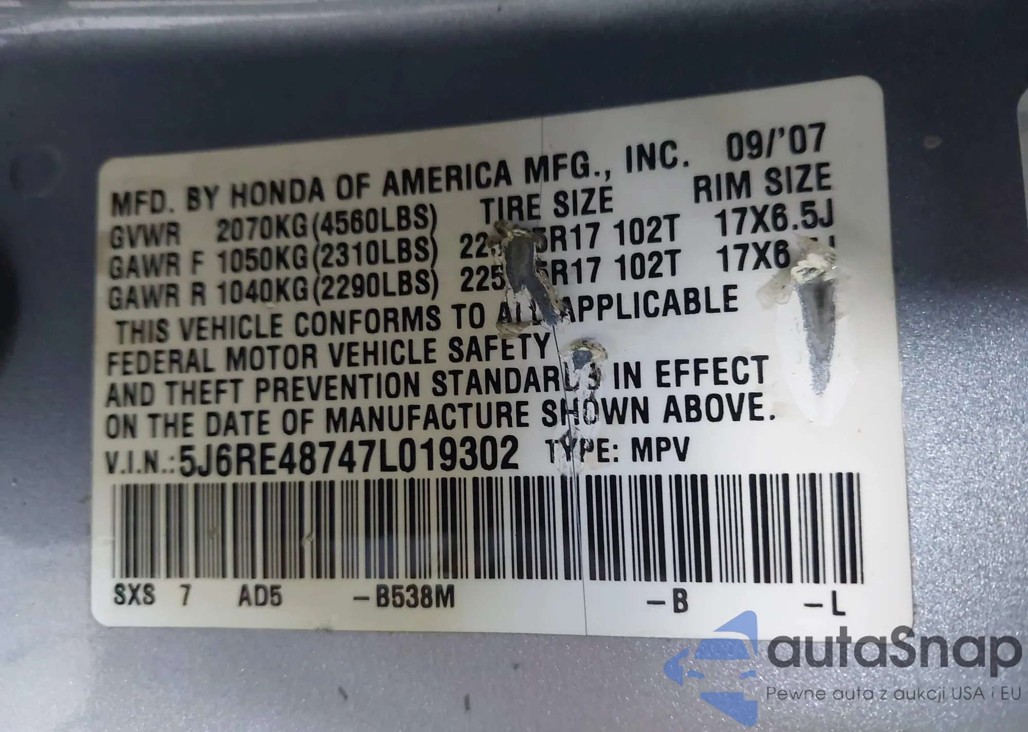 VIN: 5J6RE48747L019302