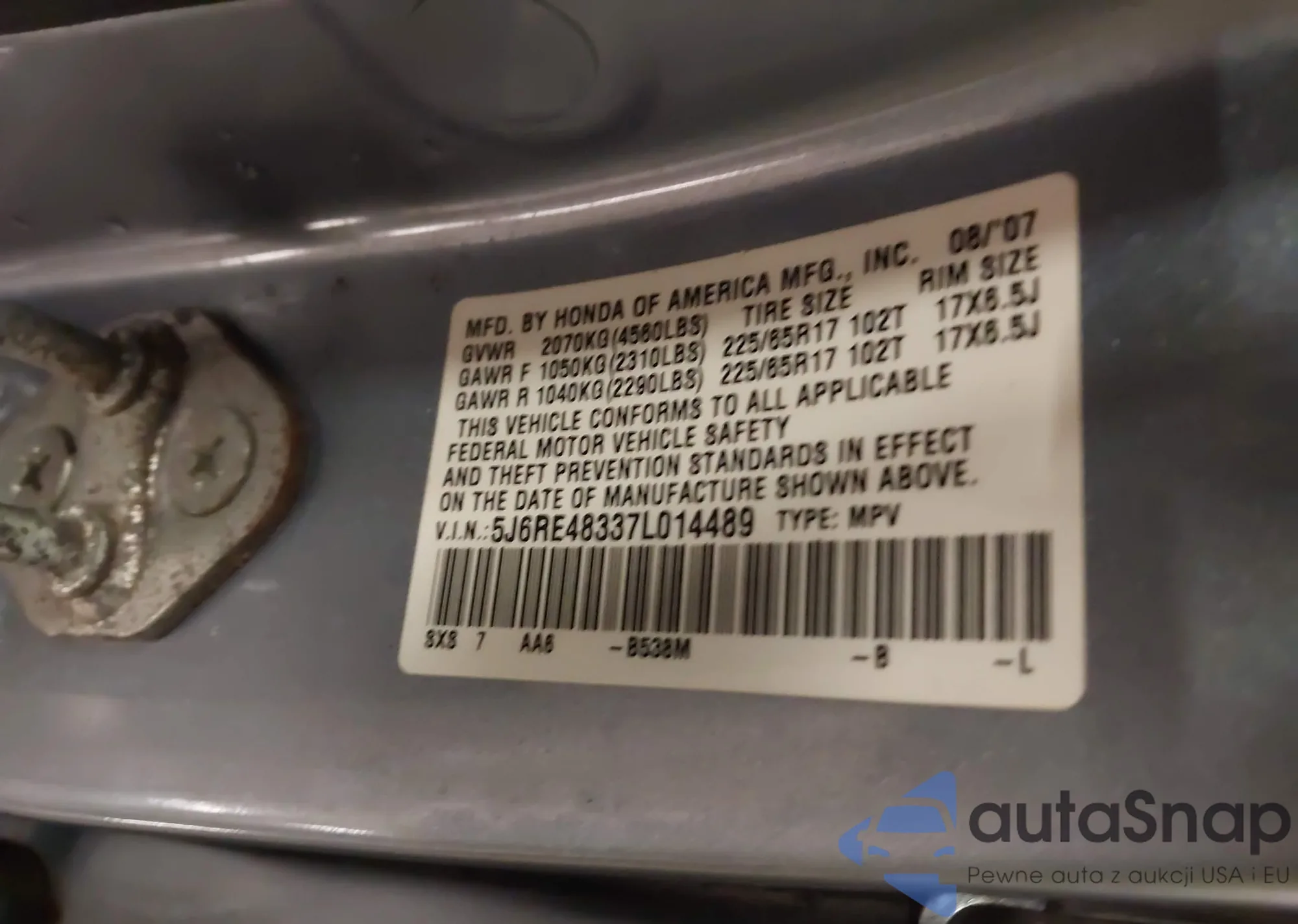 The car Honda CR-V 2007 (VIN 5J6RE48337L014489) has not been auctioned before. The documents are clean, and the mileage matches or is below the market average. Sold by an insurance company – we recommend purchase. Delivery to the port will take approx. 6–8 weeks.