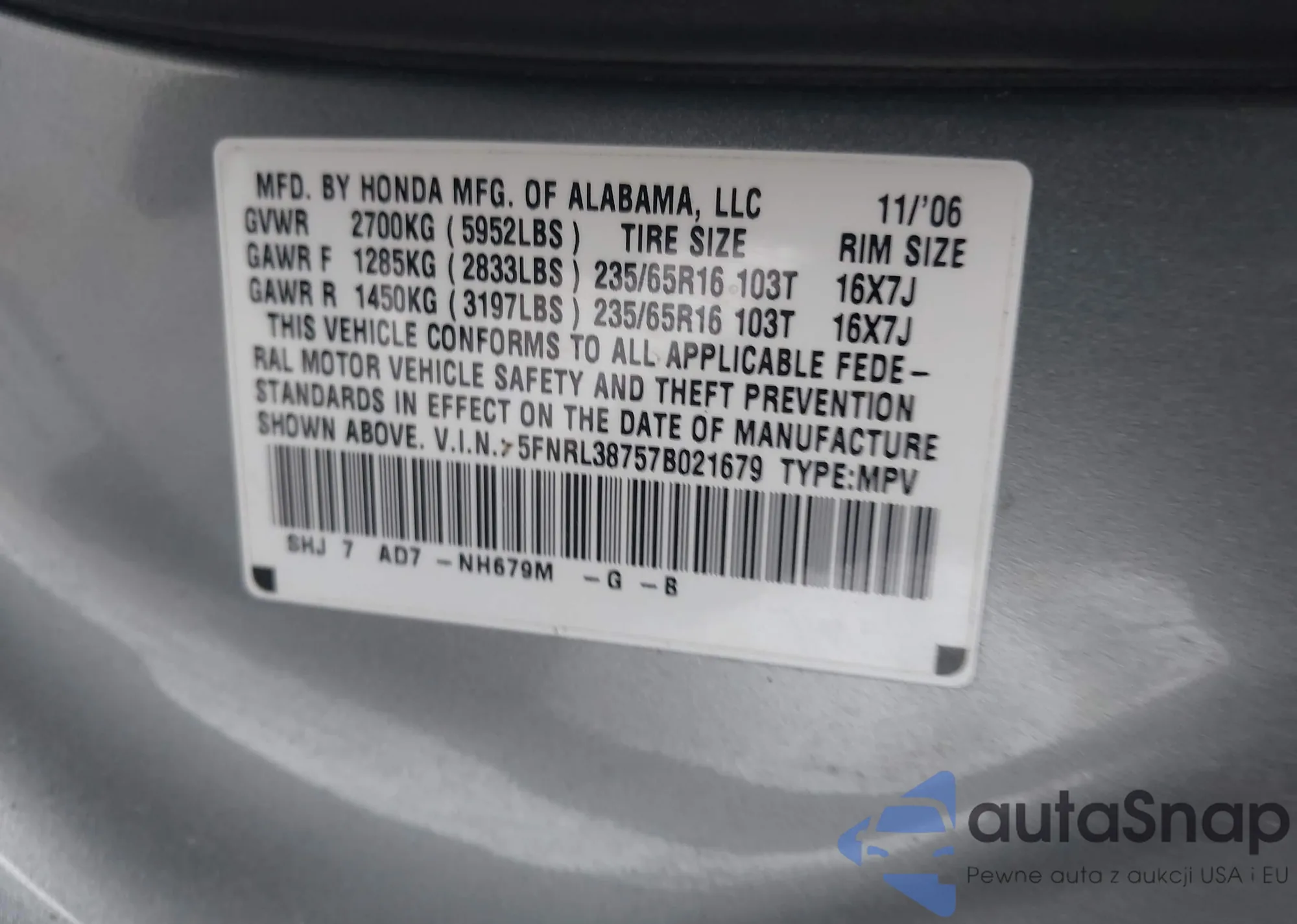 VIN: 5FNRL38757B021679