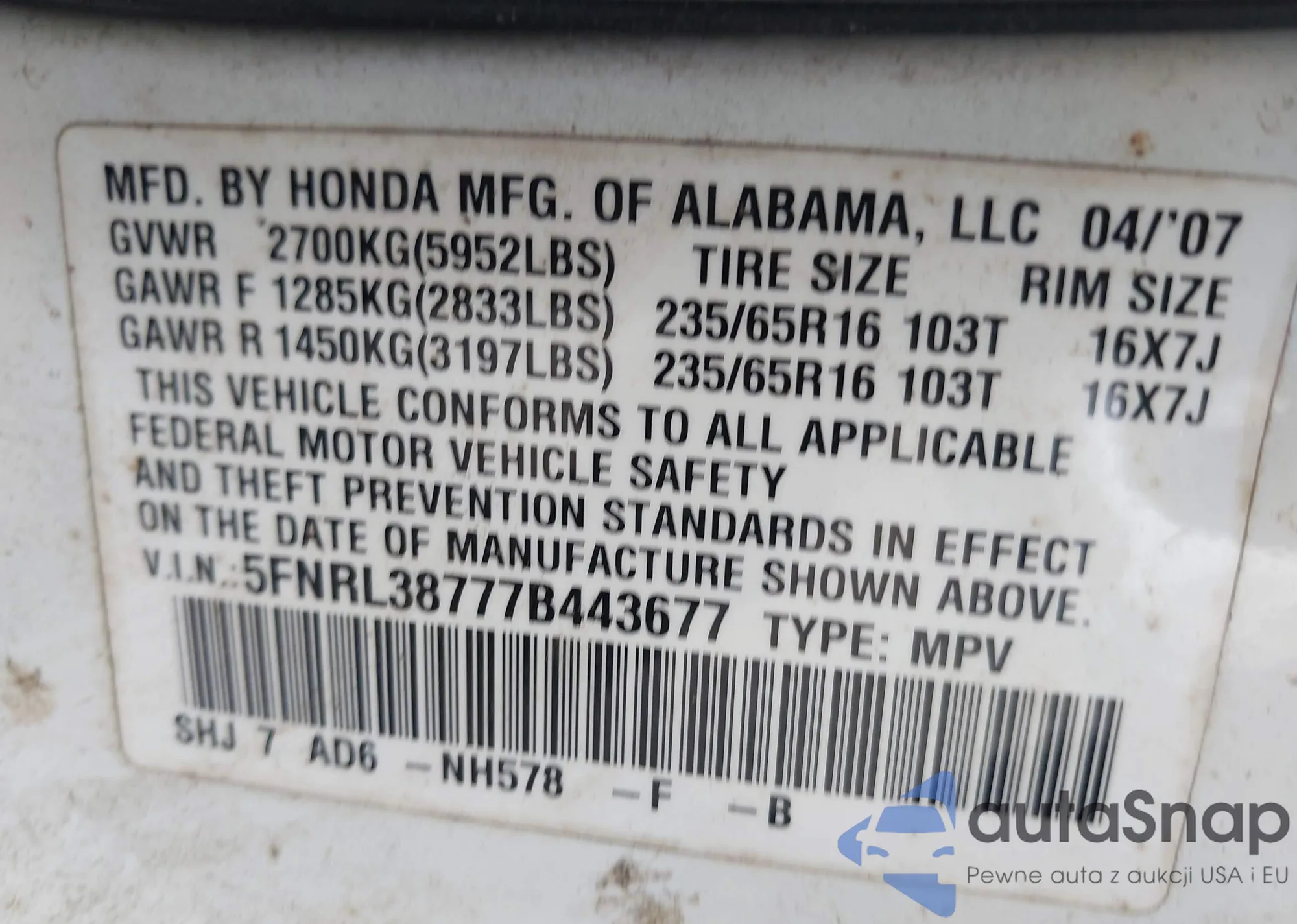 VIN: 5FNRL38777B443677