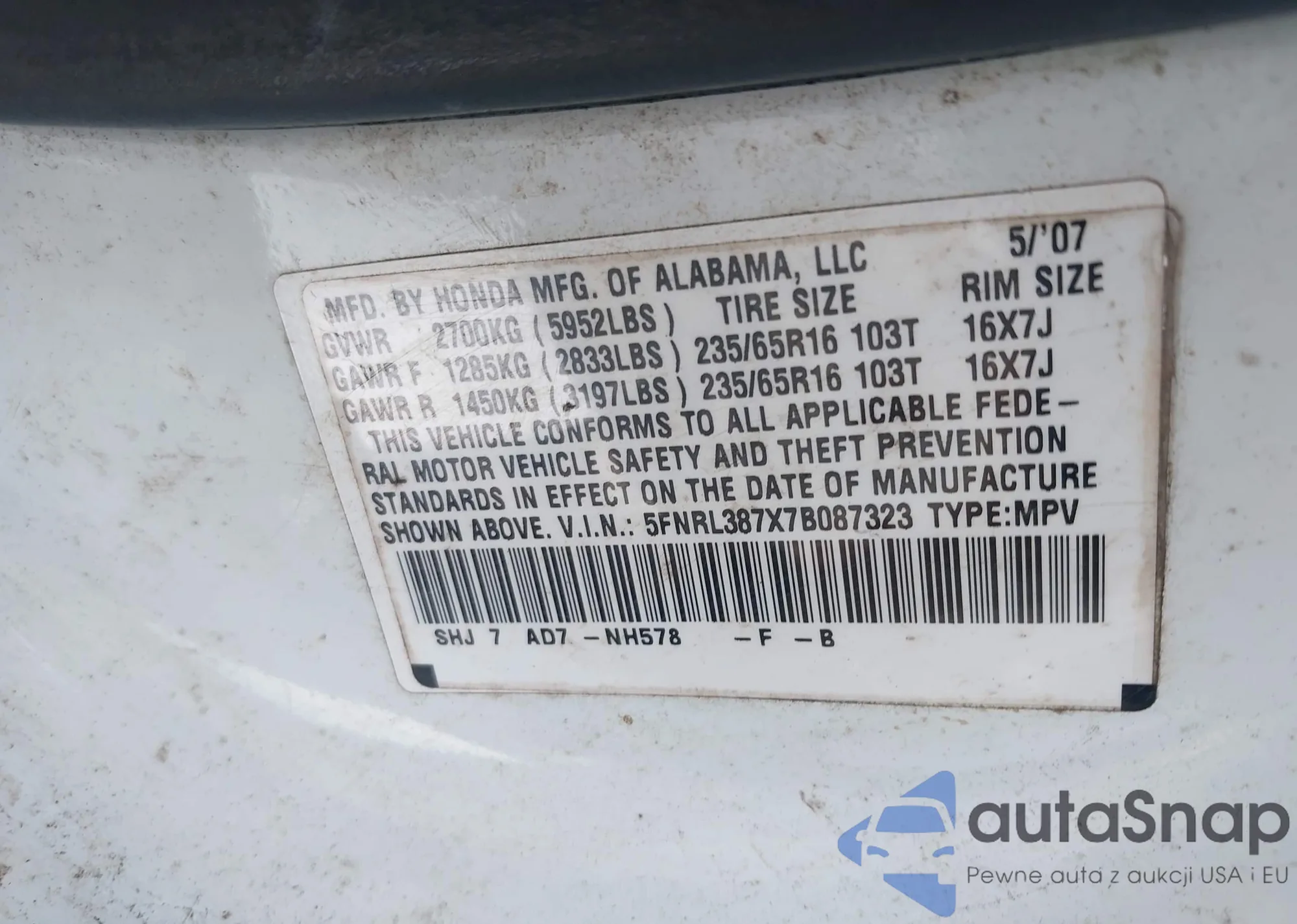 VIN: 5FNRL387X7B087323