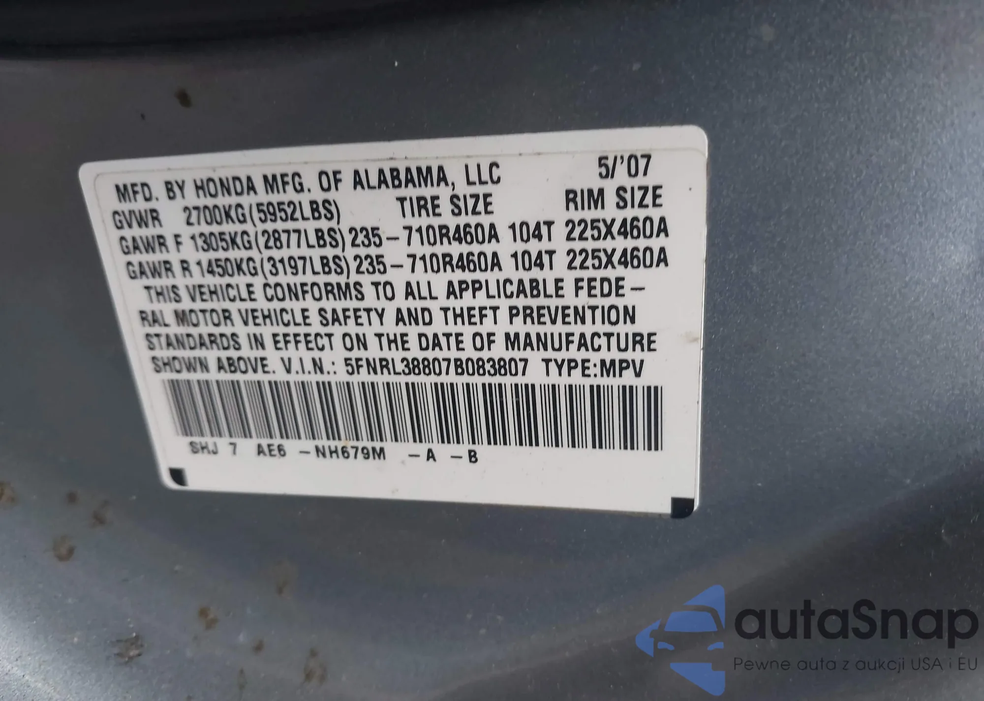 • VIN: 5FNRL38807B083807