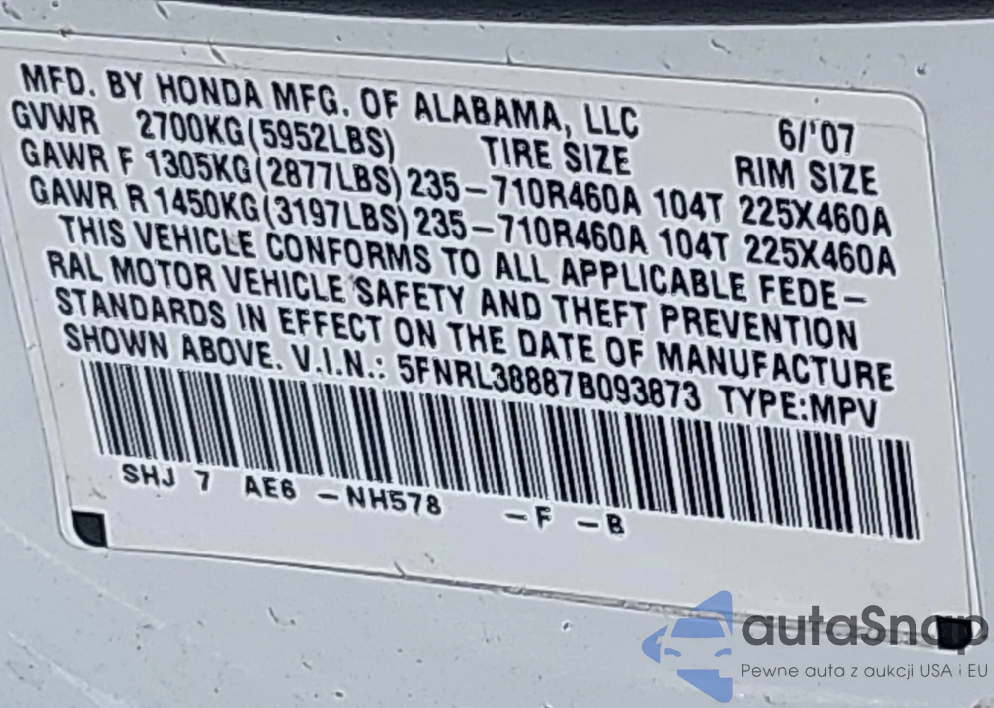 VIN: 5FNRL38887B093873