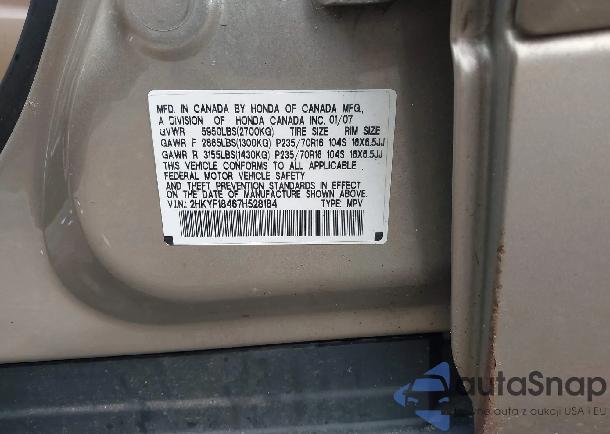 VIN: 2HKYF18467H528184