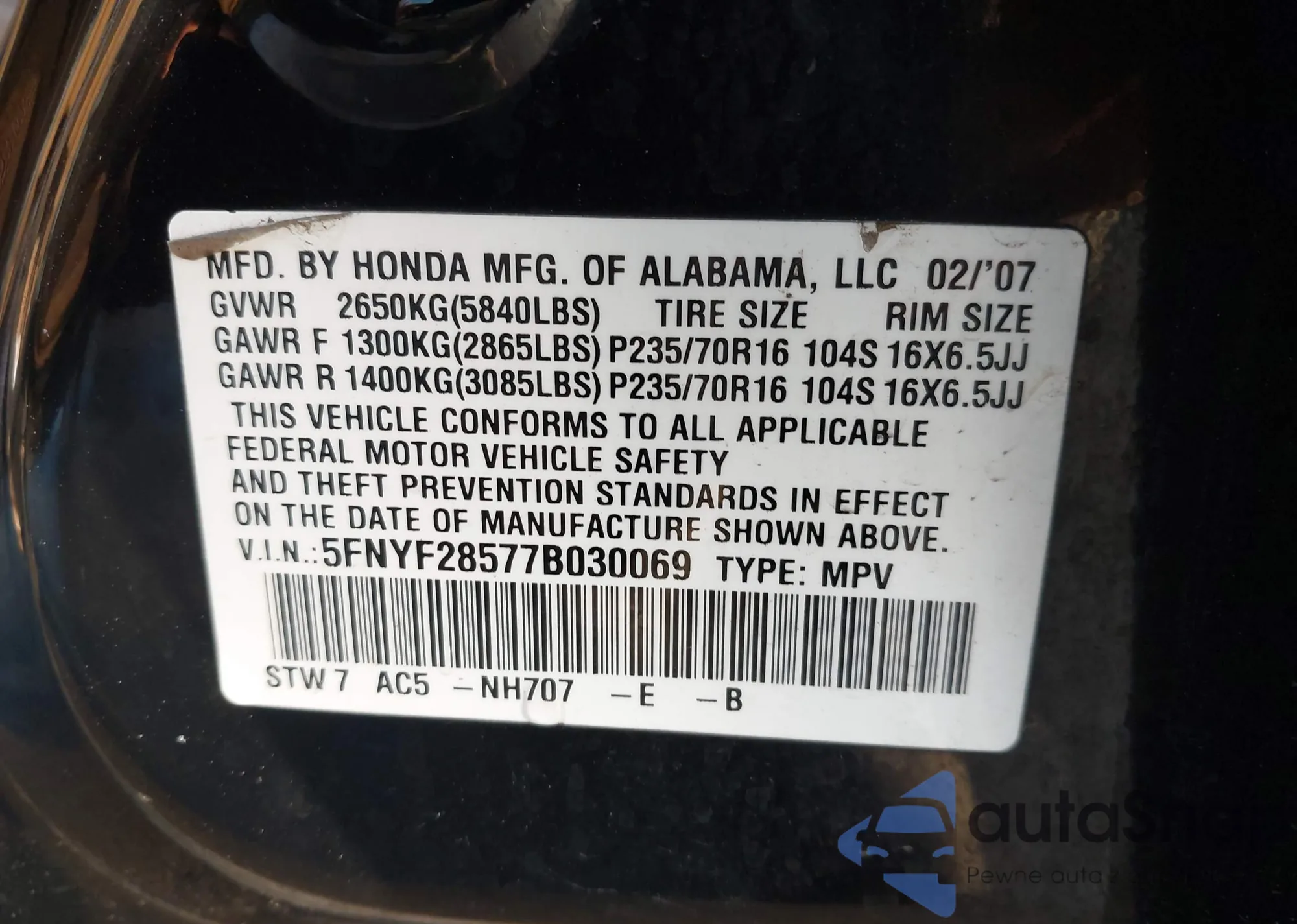 VIN: 5FNYF28577B030069