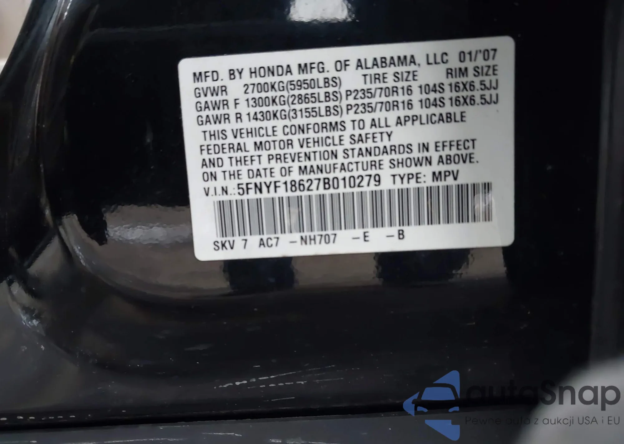 VIN: 5FNYF18627B010279