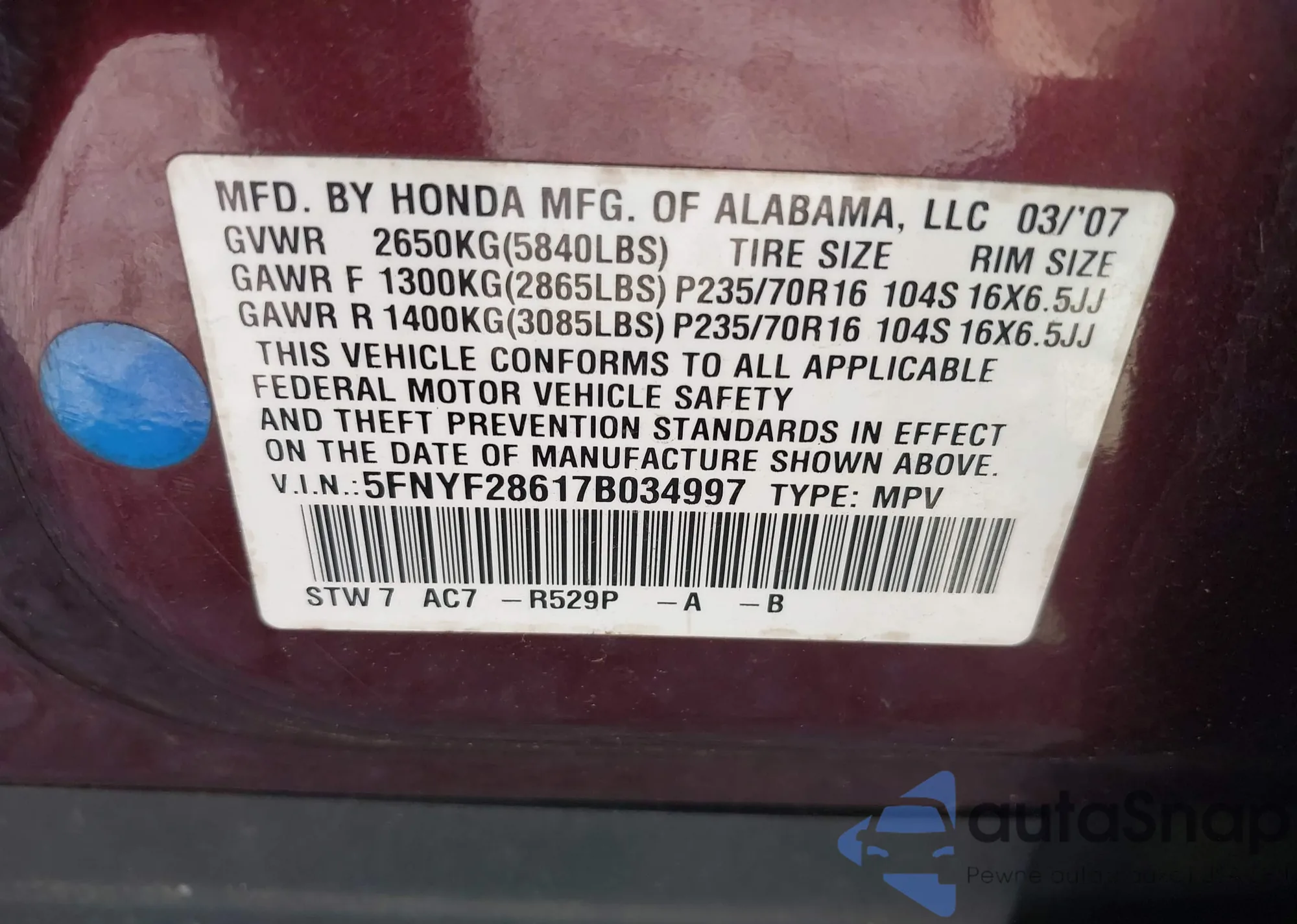 • VIN: 5FNYF28617B034997