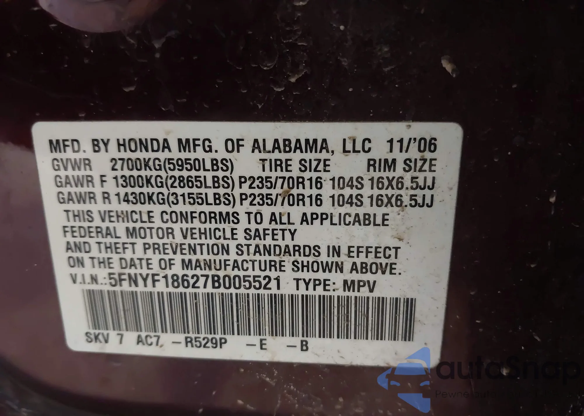 VIN: 5FNYF18627B005521