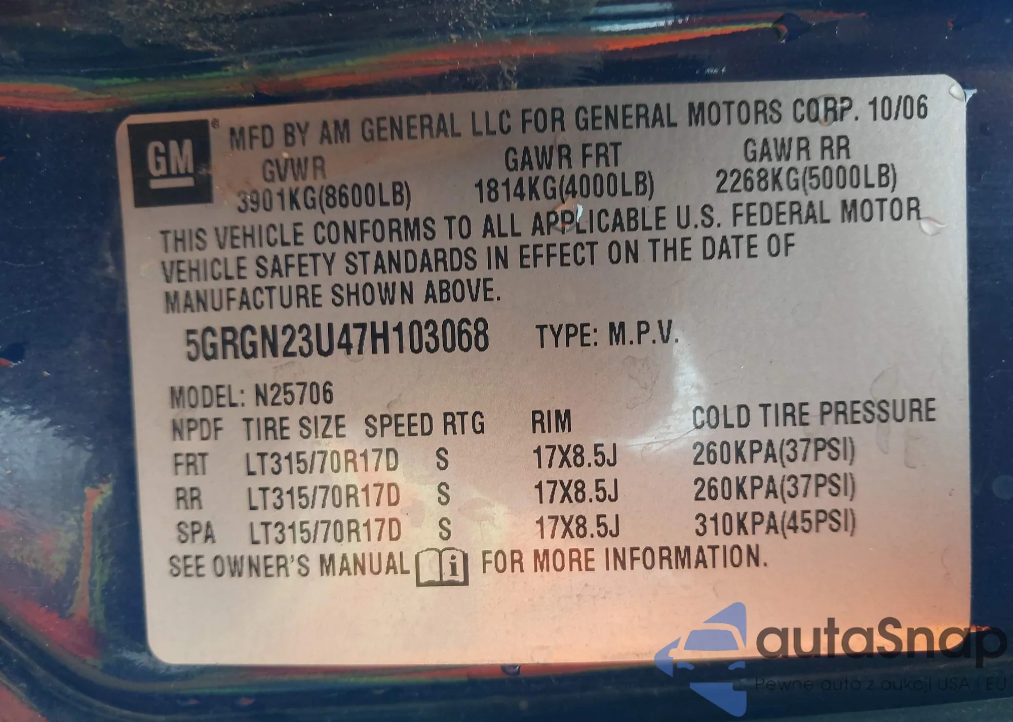 The car Hummer H2 2007 (VIN 5GRGN23U47H103068) has not been auctioned before. The documents are clean, and the mileage matches or is below the market average. Sold by an insurance company – we recommend purchase. Delivery to the port will take approx. 6–8 weeks.