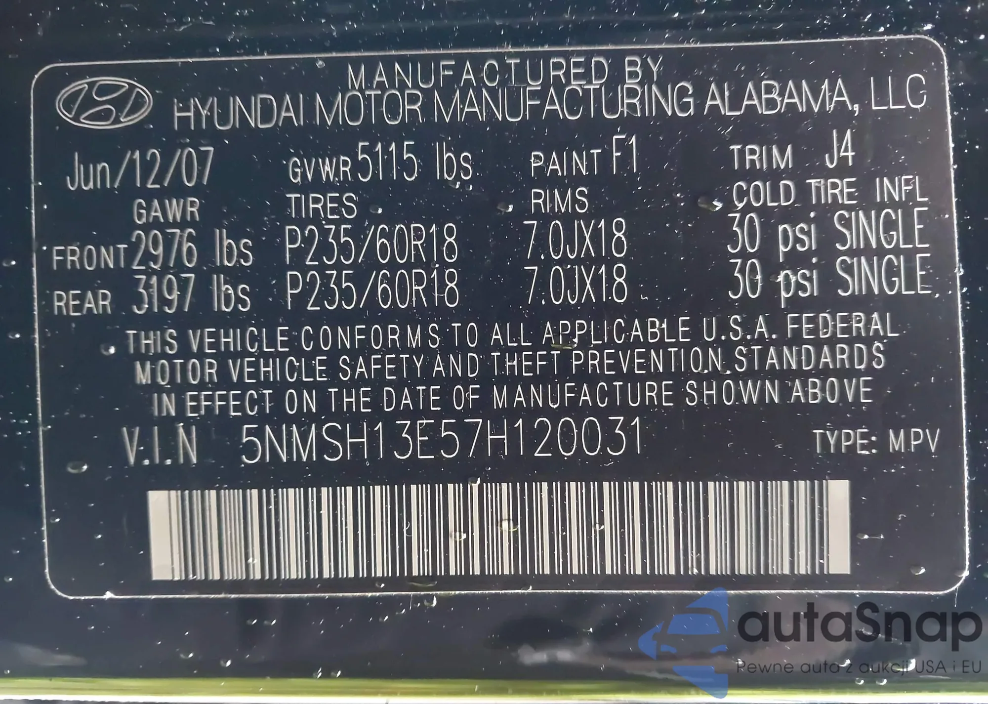 VIN: 5NMSH13E57H120031