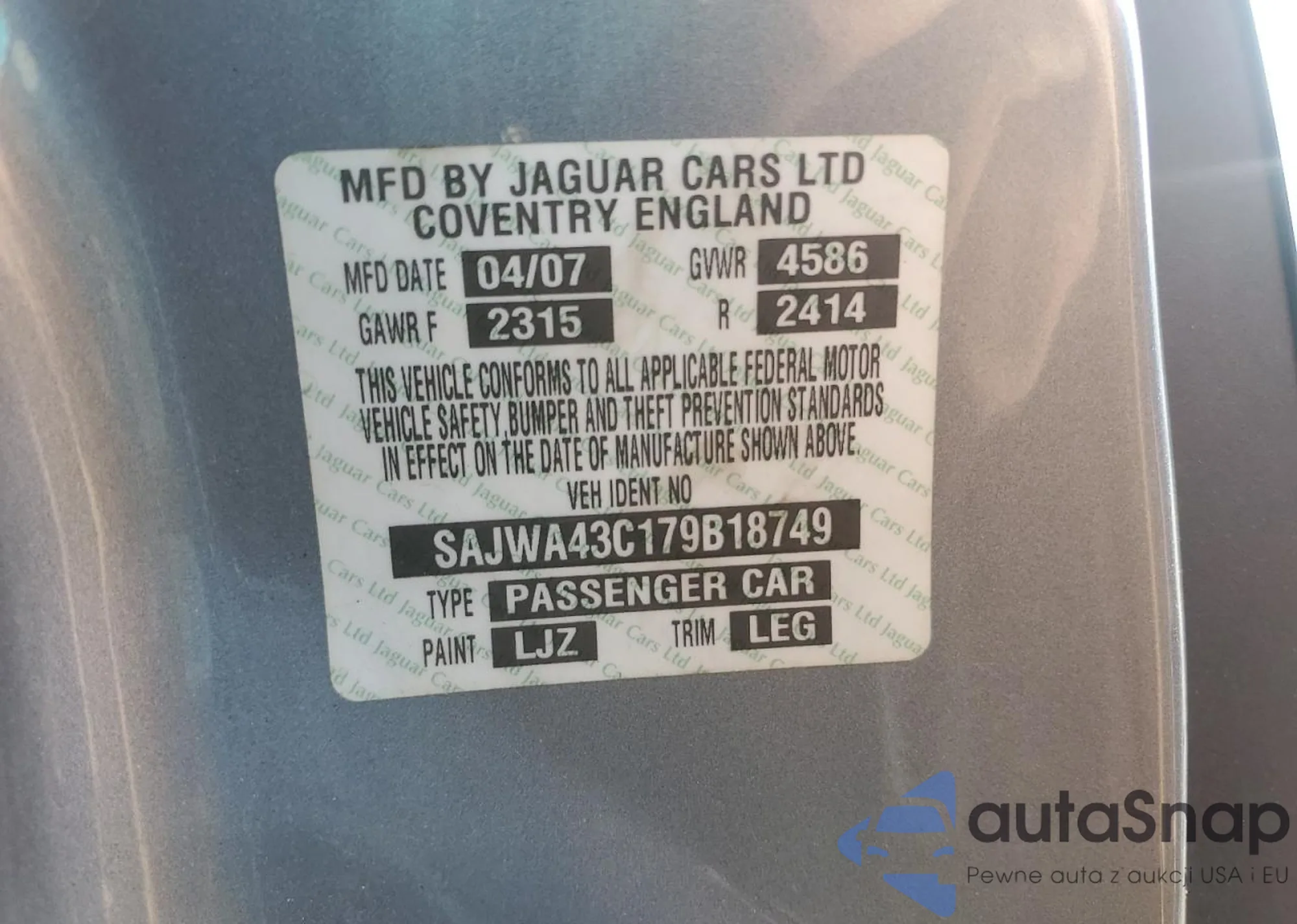 The car Jaguar XKR 2007 (VIN SAJWA43C179B18749) has documents that prevent registration. Export and registration may be difficult. Contact AutaSnap experts to find alternatives.