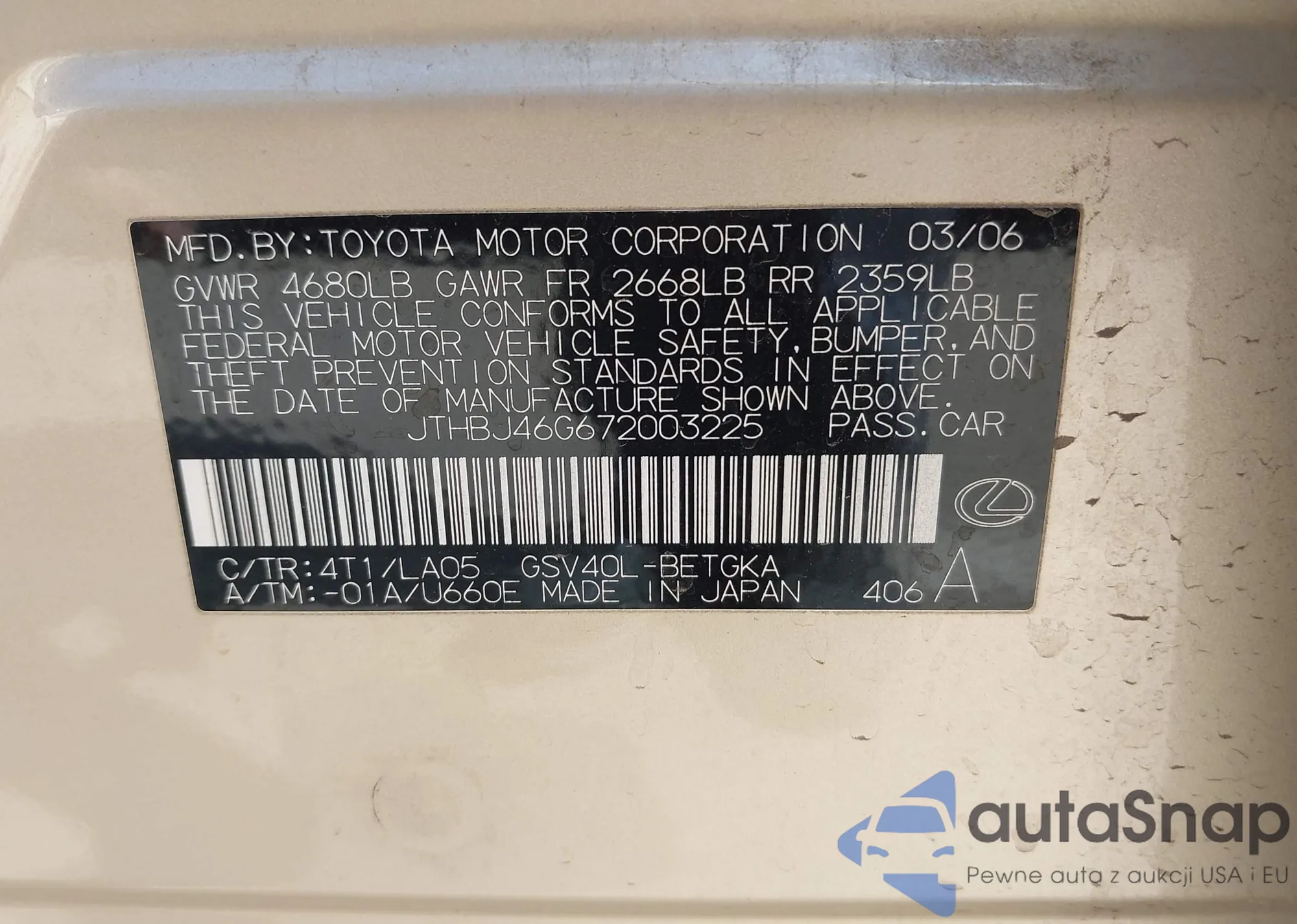 VIN: JTHBJ46G672003225