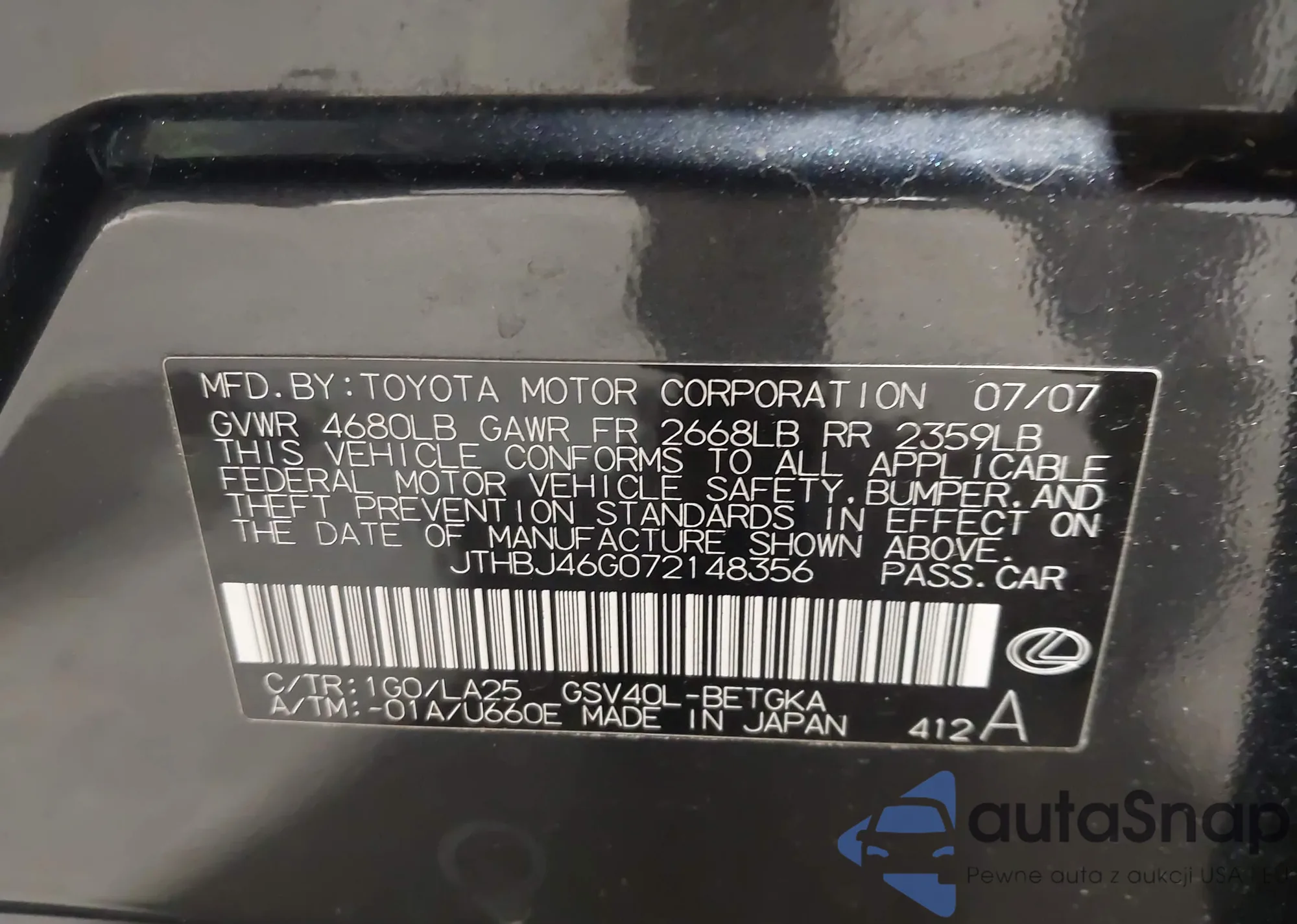 The car Lexus ES 2007 (VIN JTHBJ46G072148356) has not been auctioned before. The documents are clean, and the mileage matches or is below the market average. Sold by an insurance company – we recommend purchase. Delivery to the port will take approx. 6–8 weeks.