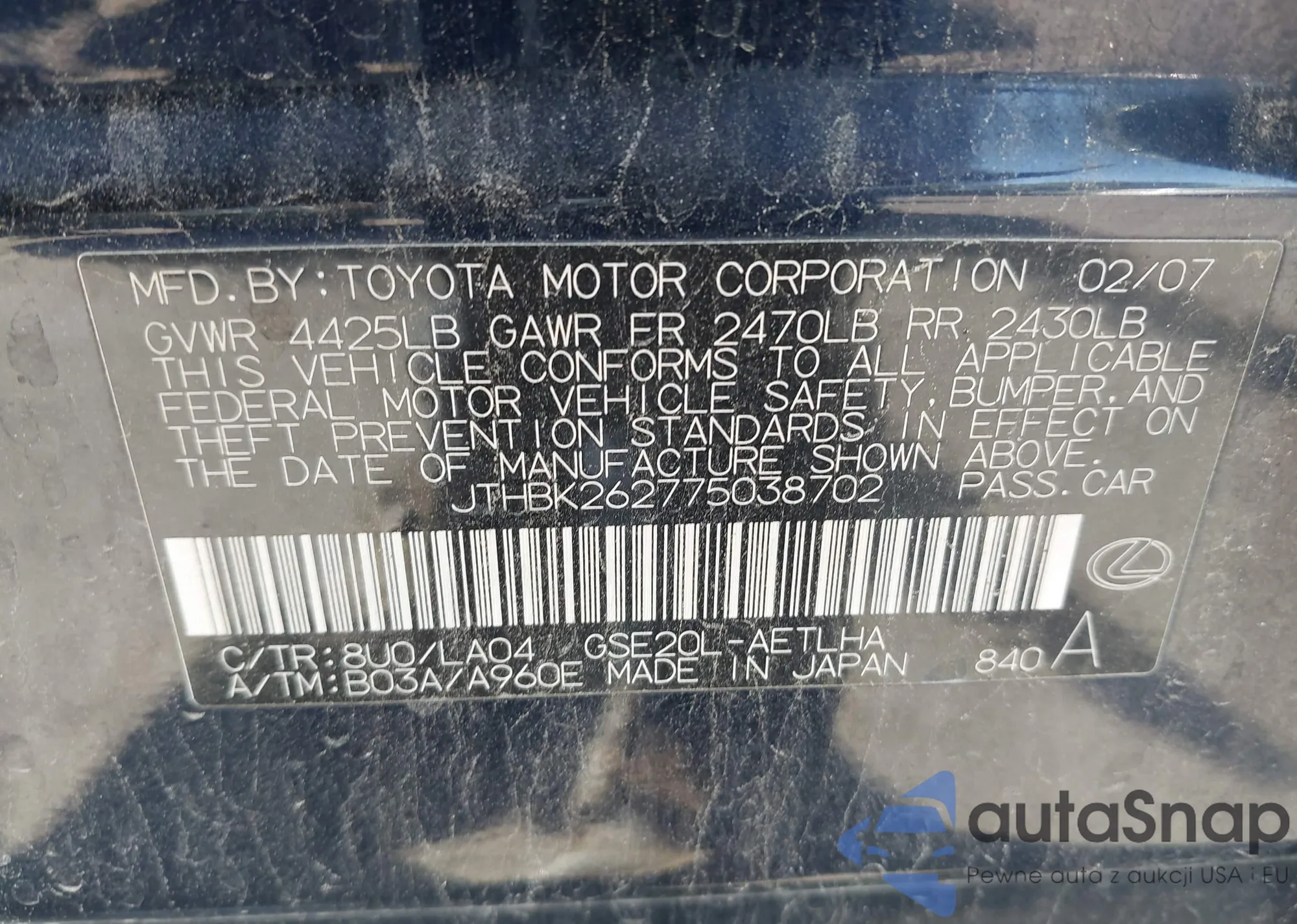 VIN: JTHBK262775038702