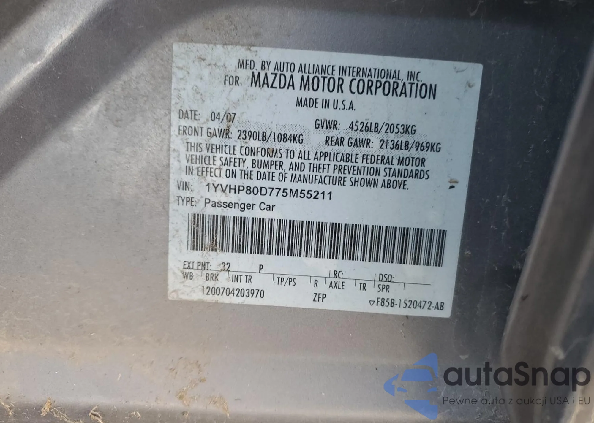The car Mazda 6 2007 (VIN 1YVHP80D775M55211) is sold by an unverified seller. We recommend checking the Carfax report and confirming registration possibilities before purchase.