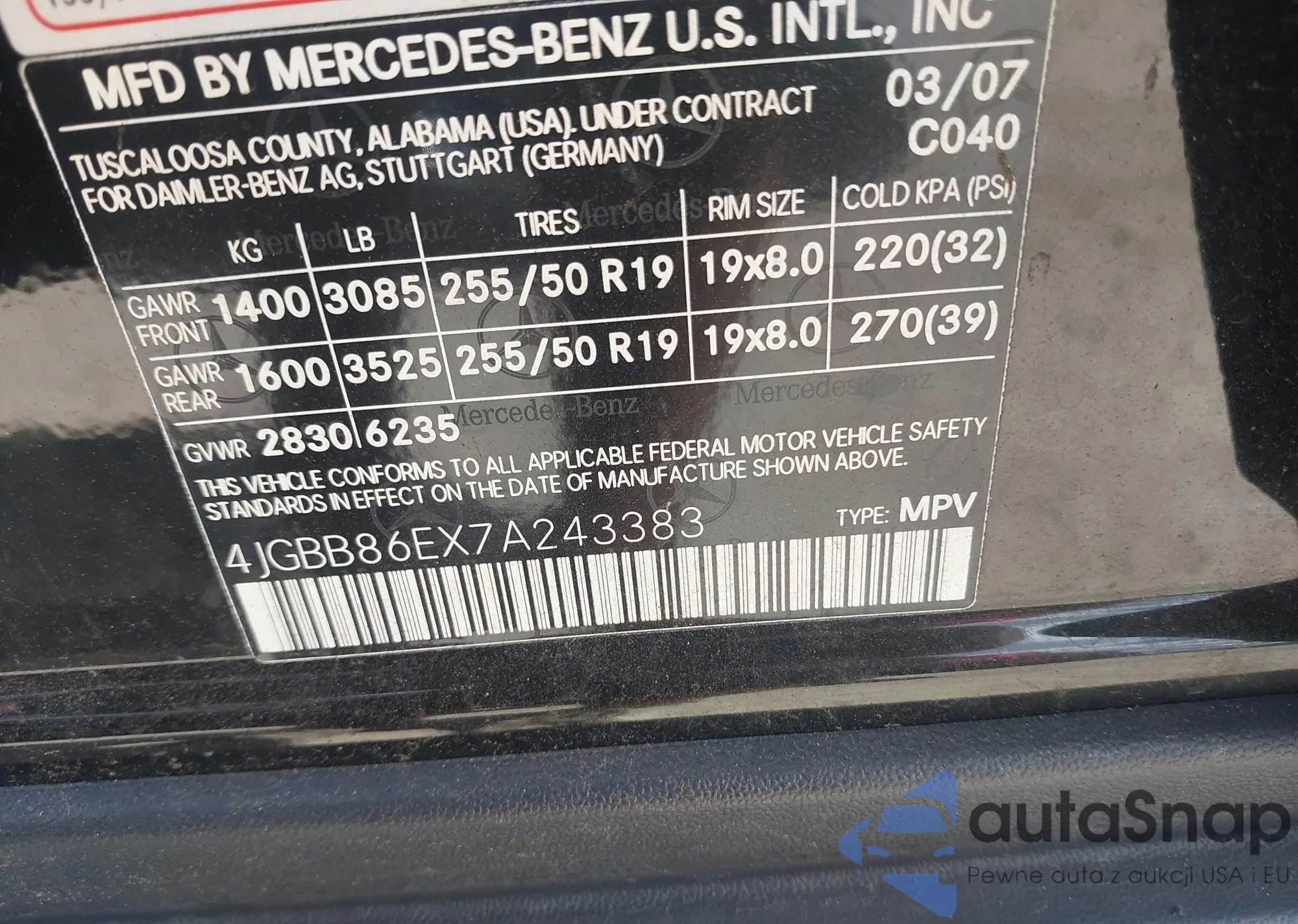 The car Mercedes-Benz M-klasse 2007 (VIN 4JGBB86EX7A243383) has not been auctioned before. The documents are clean, and the mileage matches or is below the market average. Sold by an insurance company – we recommend purchase. Delivery to the port will take approx. 6–8 weeks.