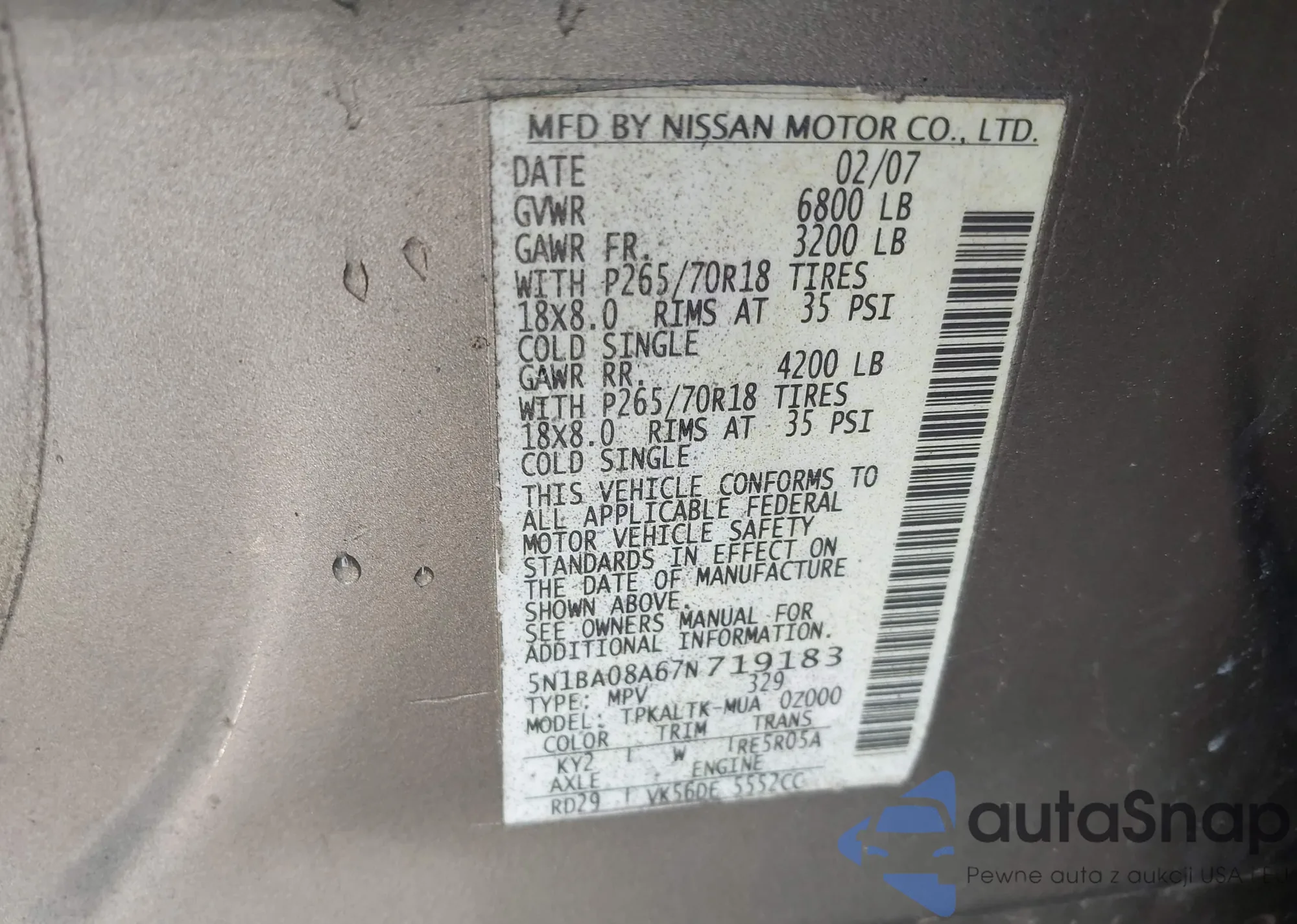 • VIN: 5N1BA08A67N719183