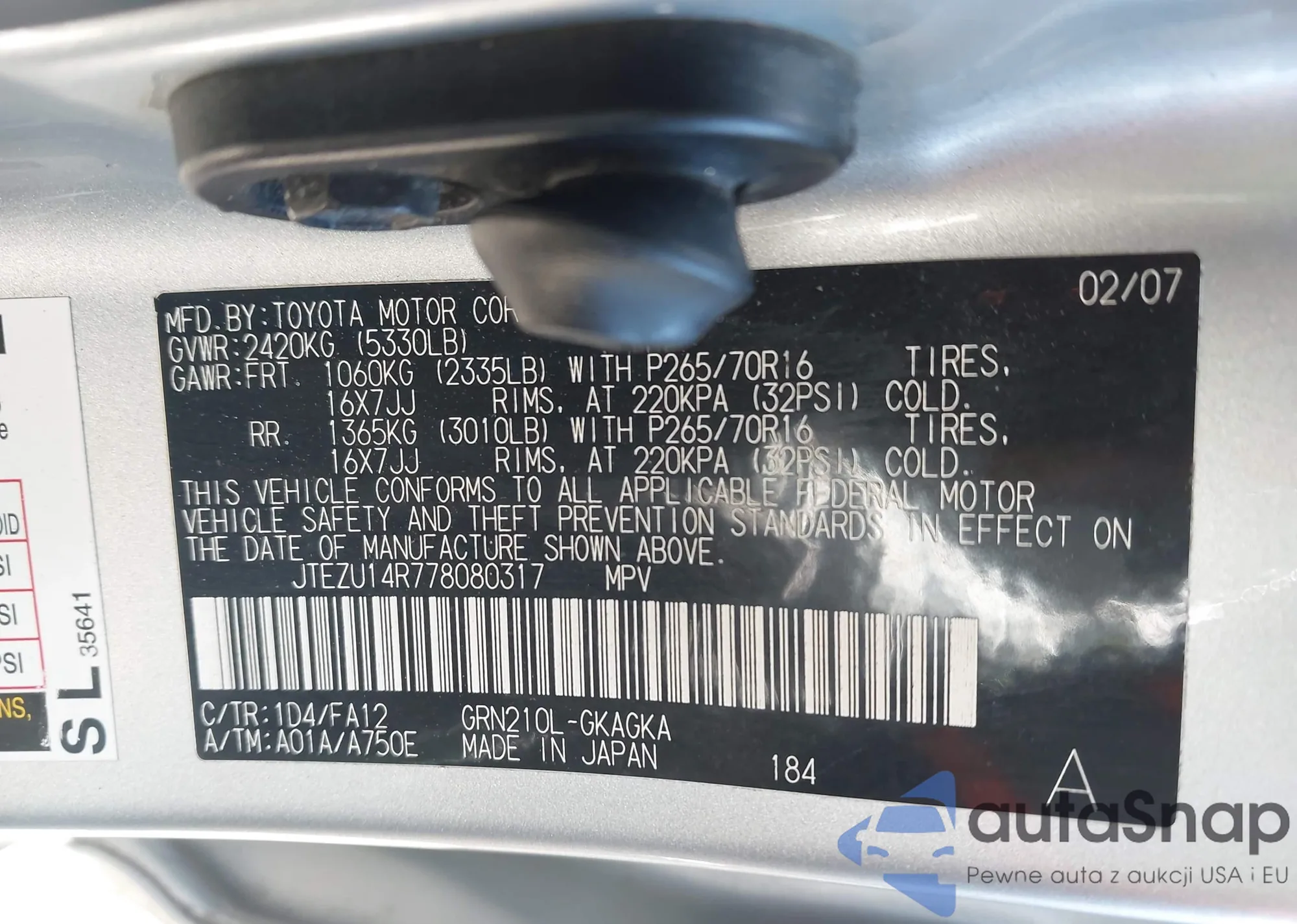 The car Toyota 4Runner 2007 (VIN JTEZU14R778080317) is sold by an unverified seller. We recommend checking the Carfax report and confirming registration possibilities before purchase.