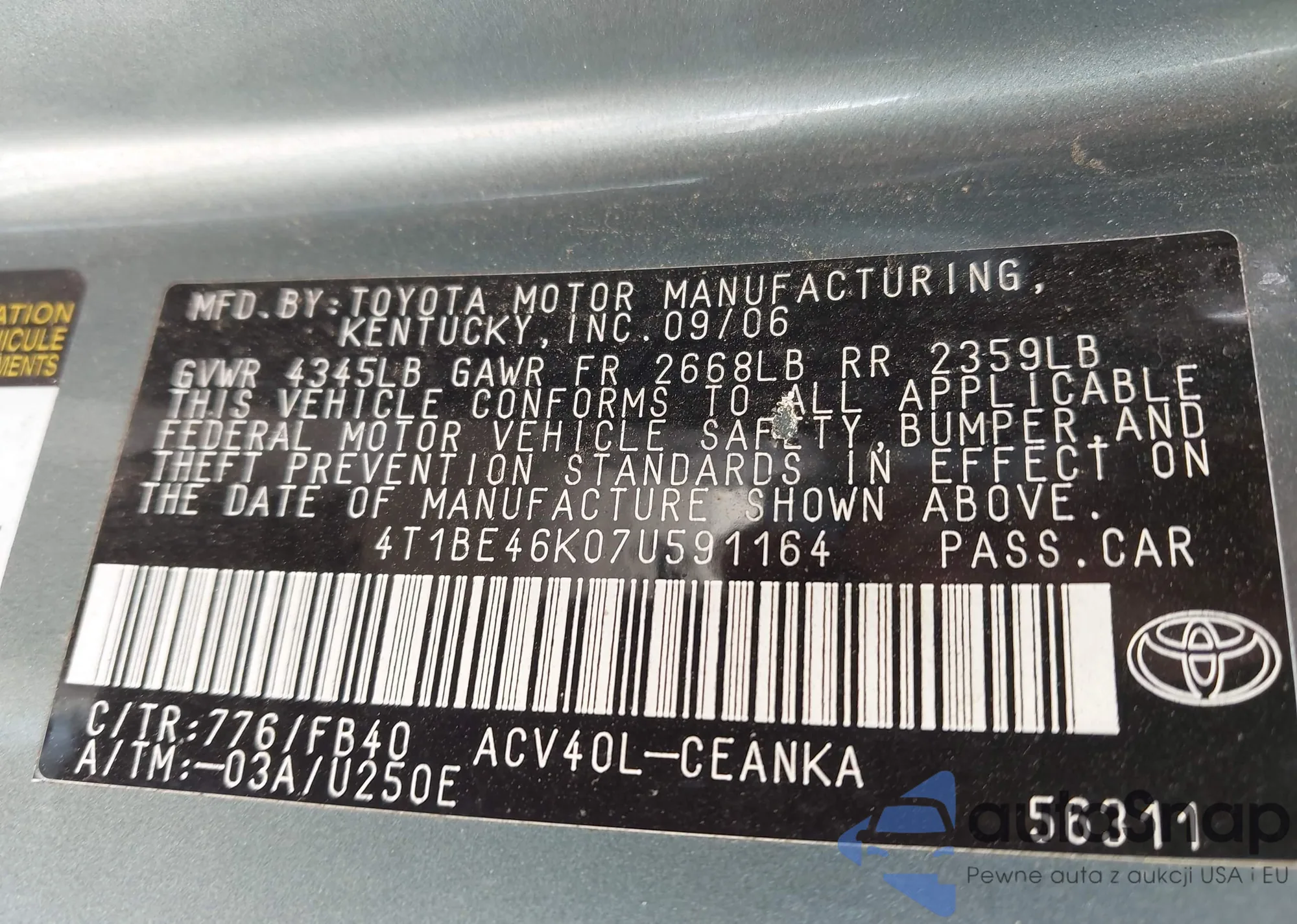 The car Toyota Camry 2007 (VIN 4T1BE46K07U591164) is sold by an unverified seller. We recommend checking the Carfax report and confirming registration possibilities before purchase.