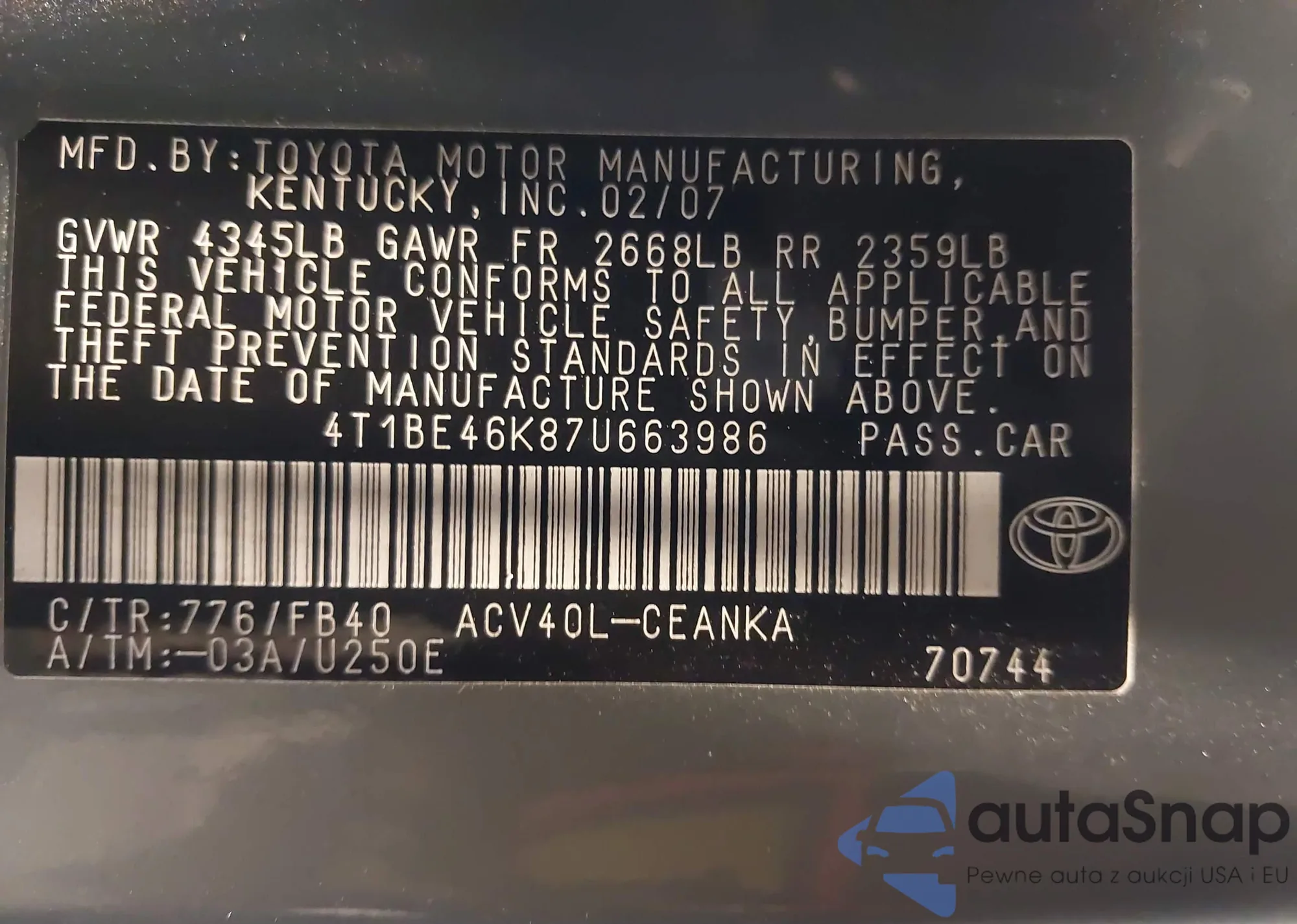 VIN: 4T1BE46K87U663986