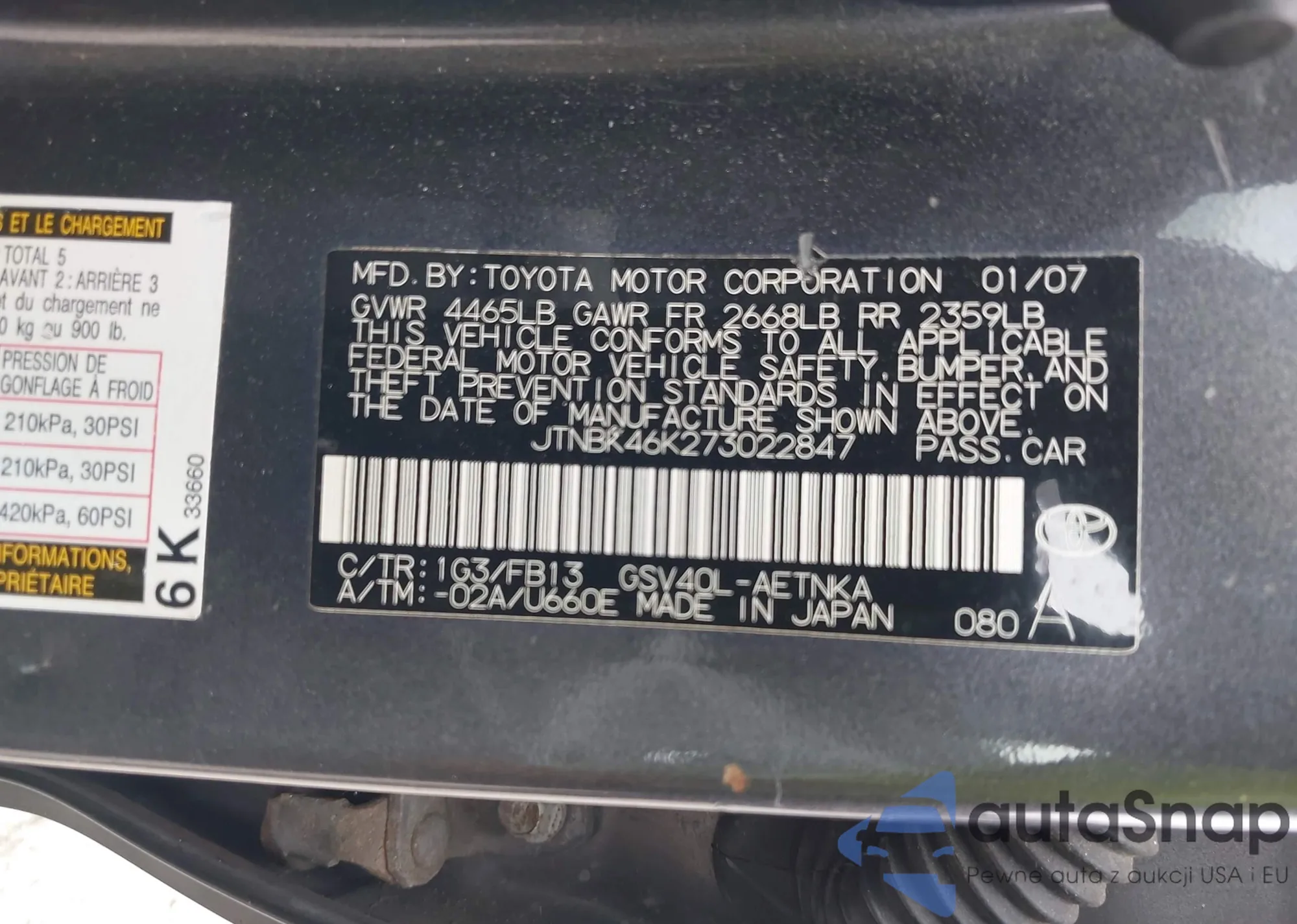 Toyota Camry 2007 – Vehicle History (Sold at IAAI)