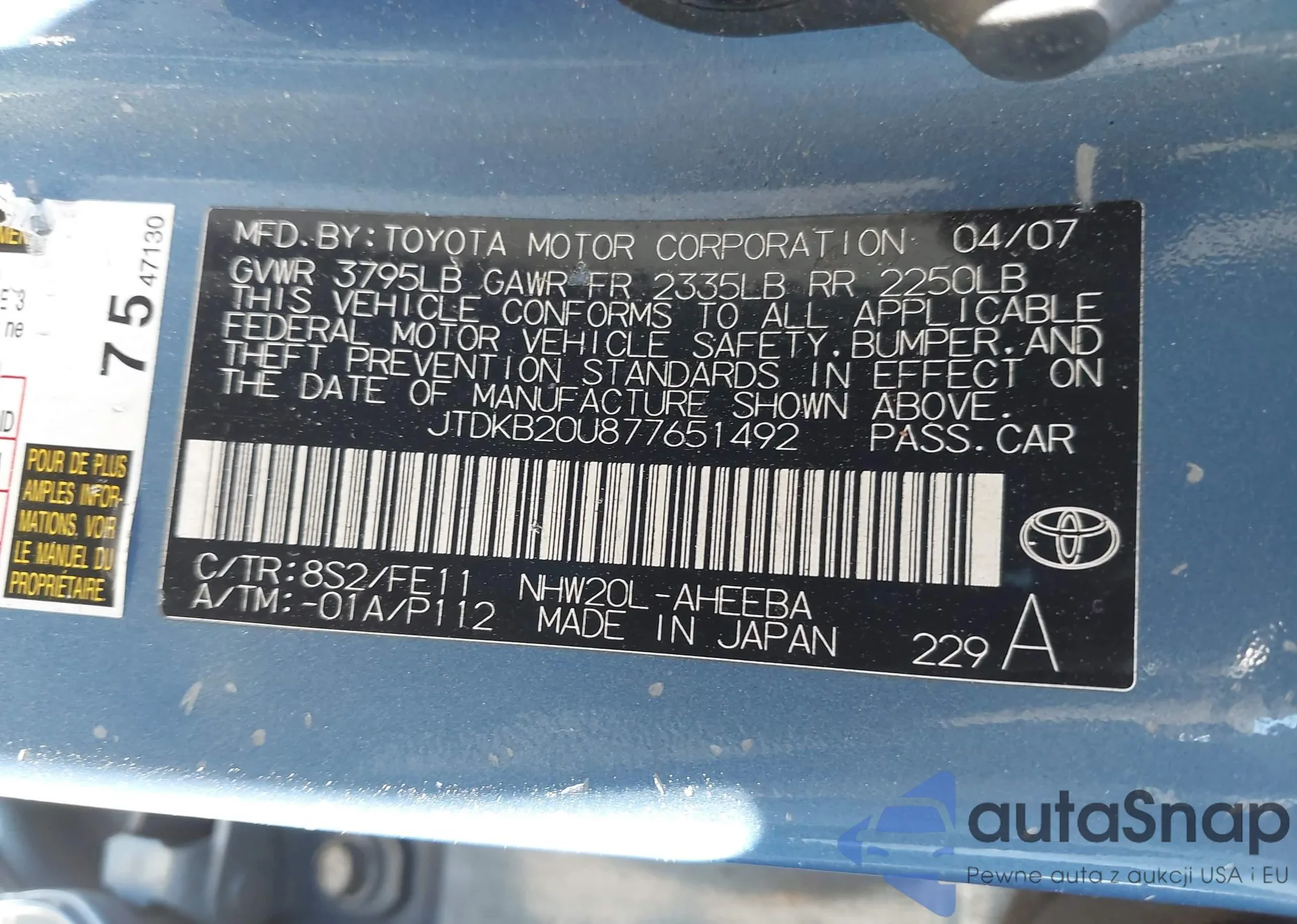 The car Toyota Prius 2007 (VIN JTDKB20U877651492) has not been auctioned before. The documents are clean, and the mileage matches or is below the market average. Sold by an insurance company – we recommend purchase. Delivery to the port will take approx. 6–8 weeks.