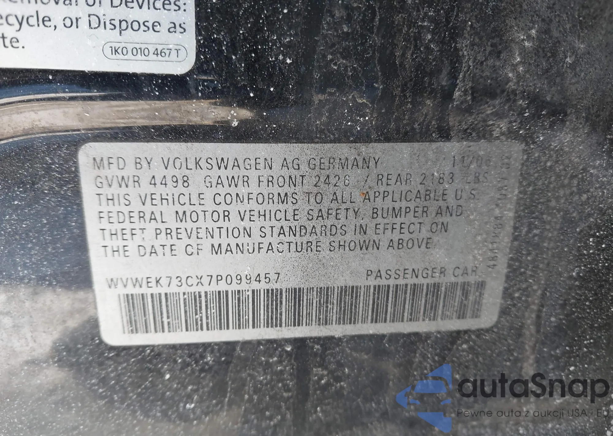 The car Volkswagen Passat 2007 (VIN WVWEK73CX7P099457) has not been auctioned before. The documents are clean, and the mileage matches or is below the market average. Sold by an insurance company – we recommend purchase. Delivery to the port will take approx. 6–8 weeks.