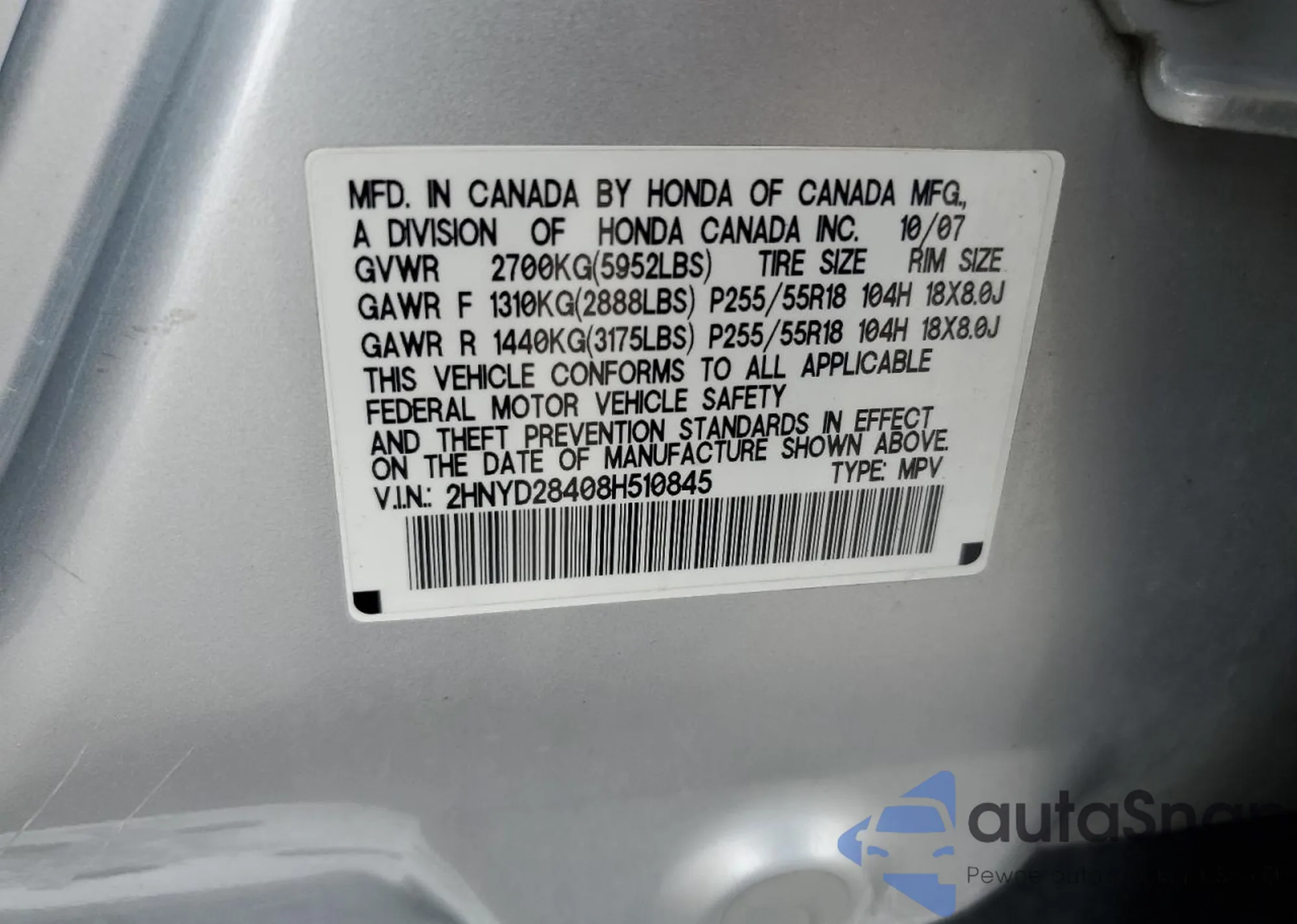 VIN: 2HNYD28408H510845