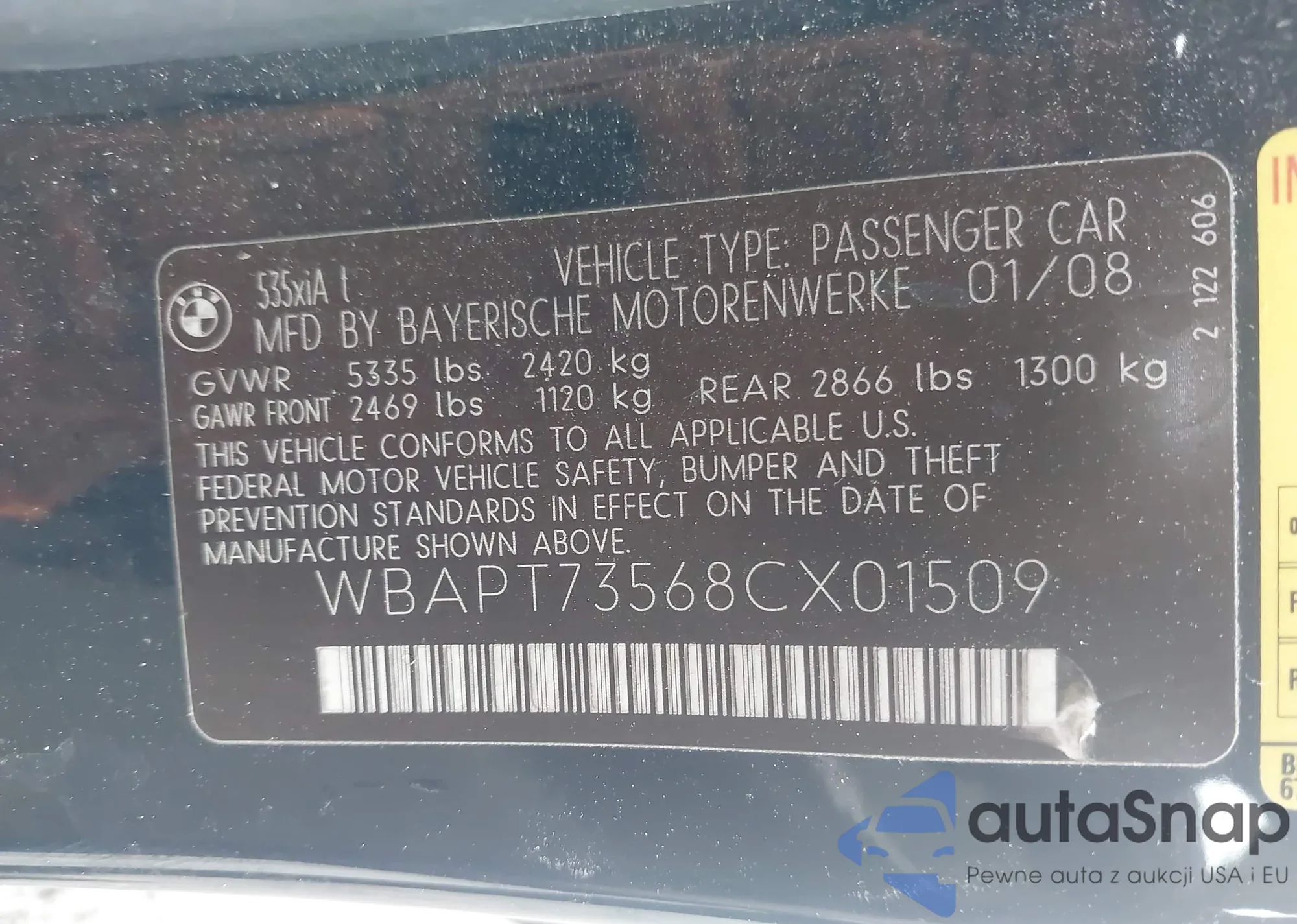 • VIN: WBAPT73568CX01509