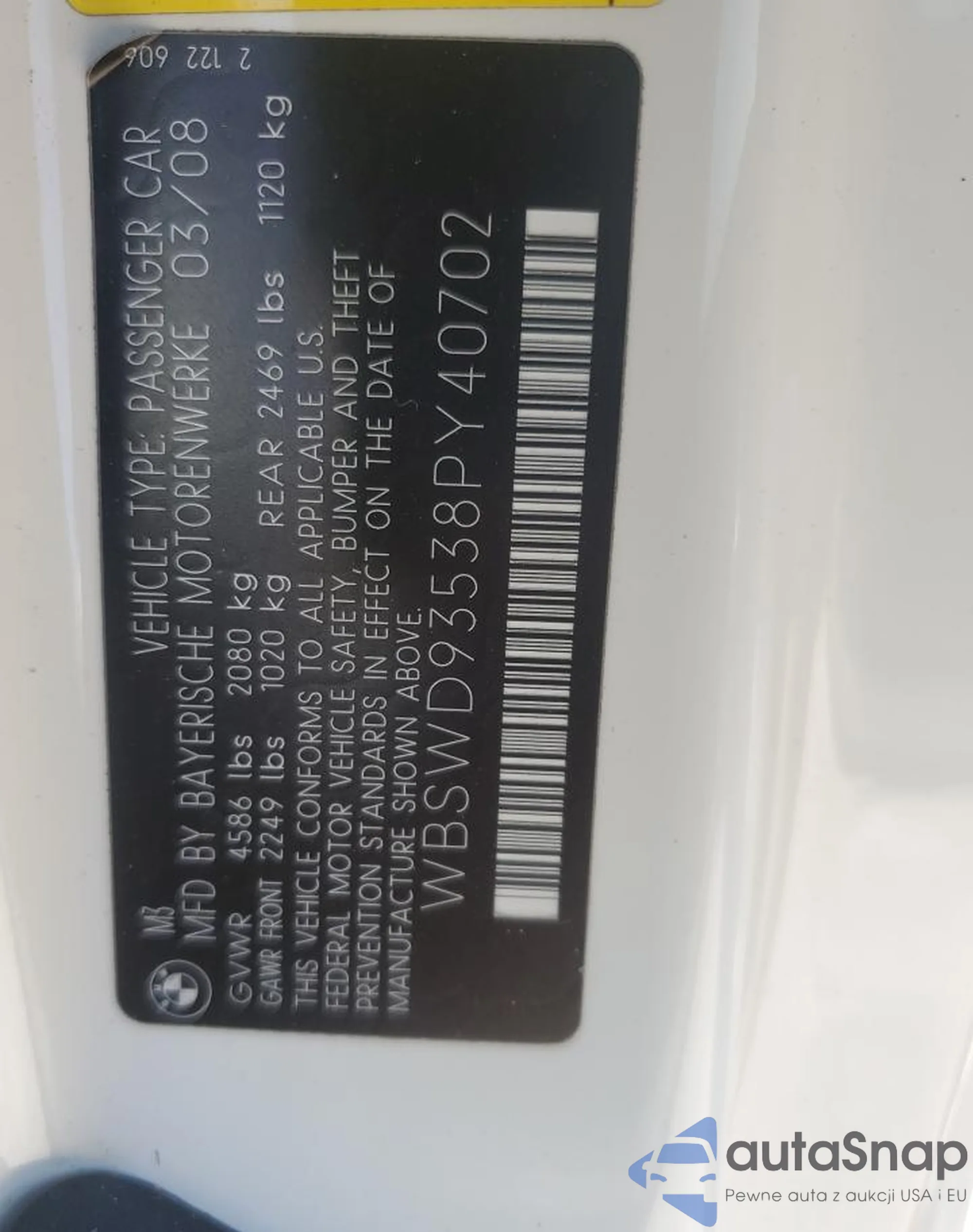 The car BMW M3 2008 (VIN WBSWD93538PY40702) has documents that prevent registration. Export and registration may be difficult. Contact AutaSnap experts to find alternatives.