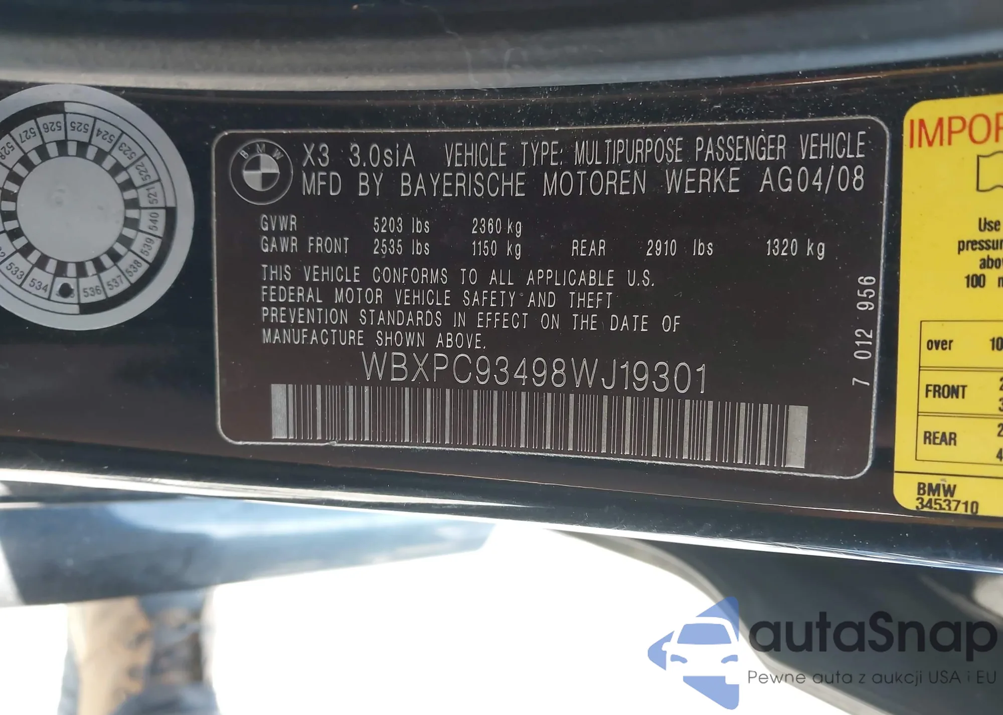 The car BMW X3 2008 (VIN WBXPC93498WJ19301) has not been auctioned before. The documents are clean, and the mileage matches or is below the market average. Sold by an insurance company – we recommend purchase. Delivery to the port will take approx. 6–8 weeks.