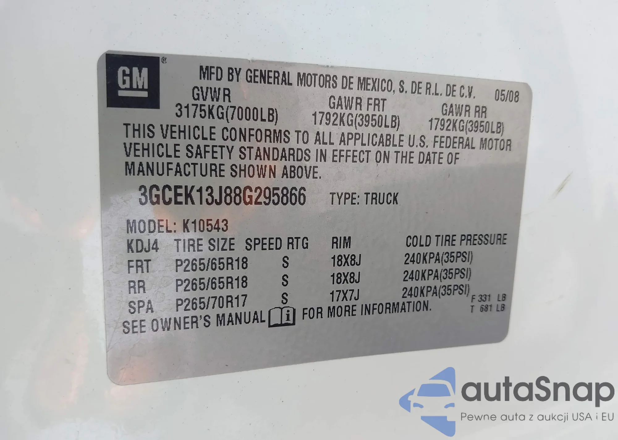 • VIN: 3GCEK13J88G295866