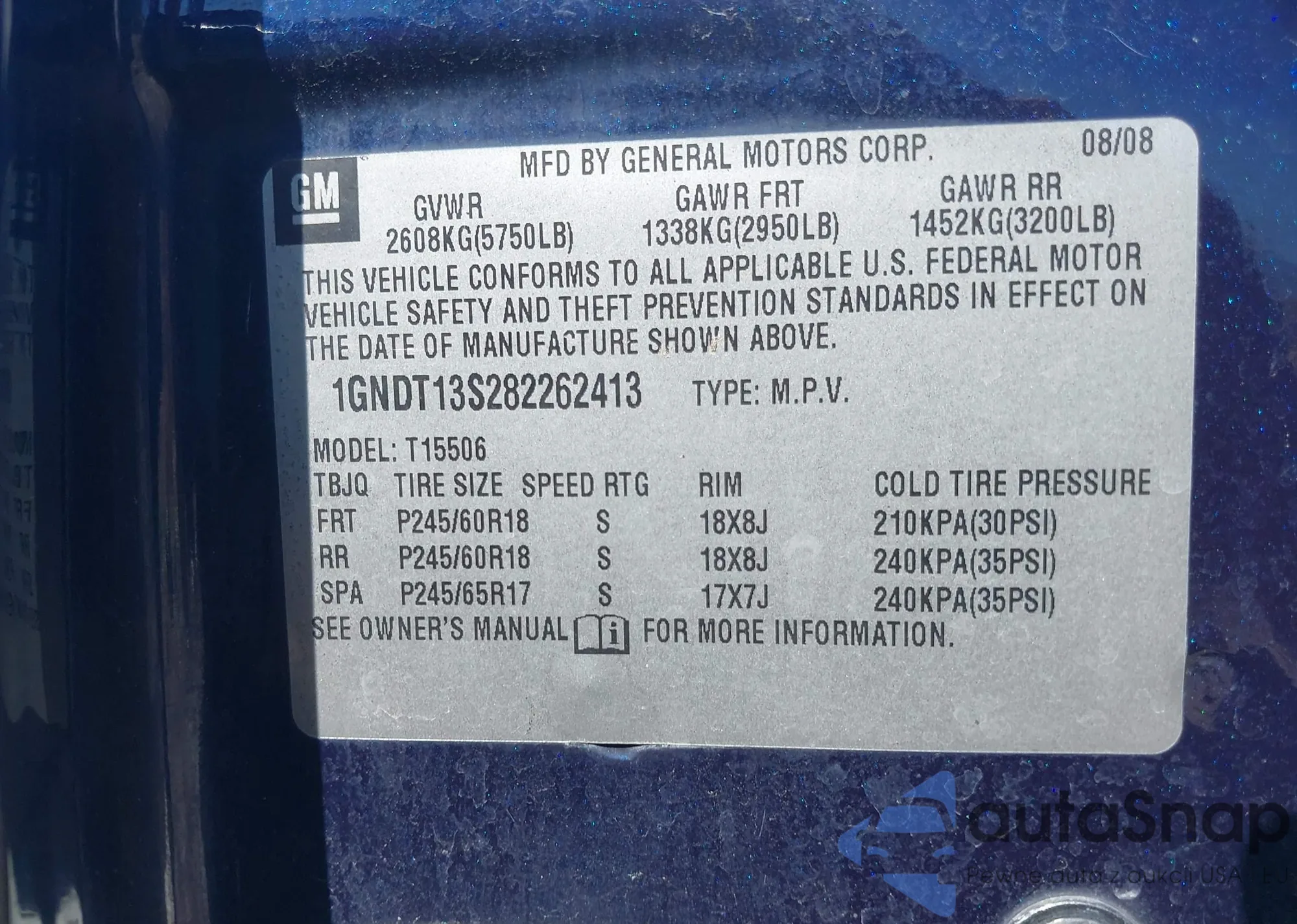 The car Chevrolet TrailBlazer 2008 (VIN 1GNDT13S282262413) has not been auctioned before. The documents are clean, and the mileage matches or is below the market average. Sold by an insurance company – we recommend purchase. Delivery to the port will take approx. 6–8 weeks.