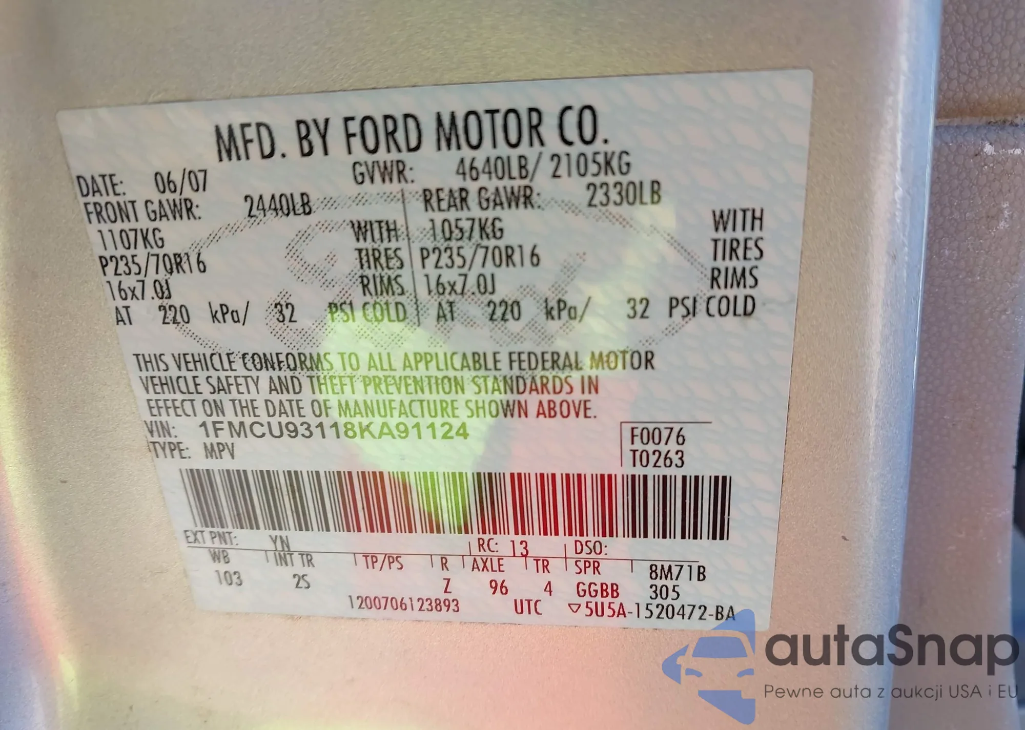The car Ford Escape 2008 (VIN 1FMCU93118KA91124) has not been auctioned before. The documents are clean, and the mileage matches or is below the market average. Sold by an insurance company – we recommend purchase. Delivery to the port will take approx. 6–8 weeks.
