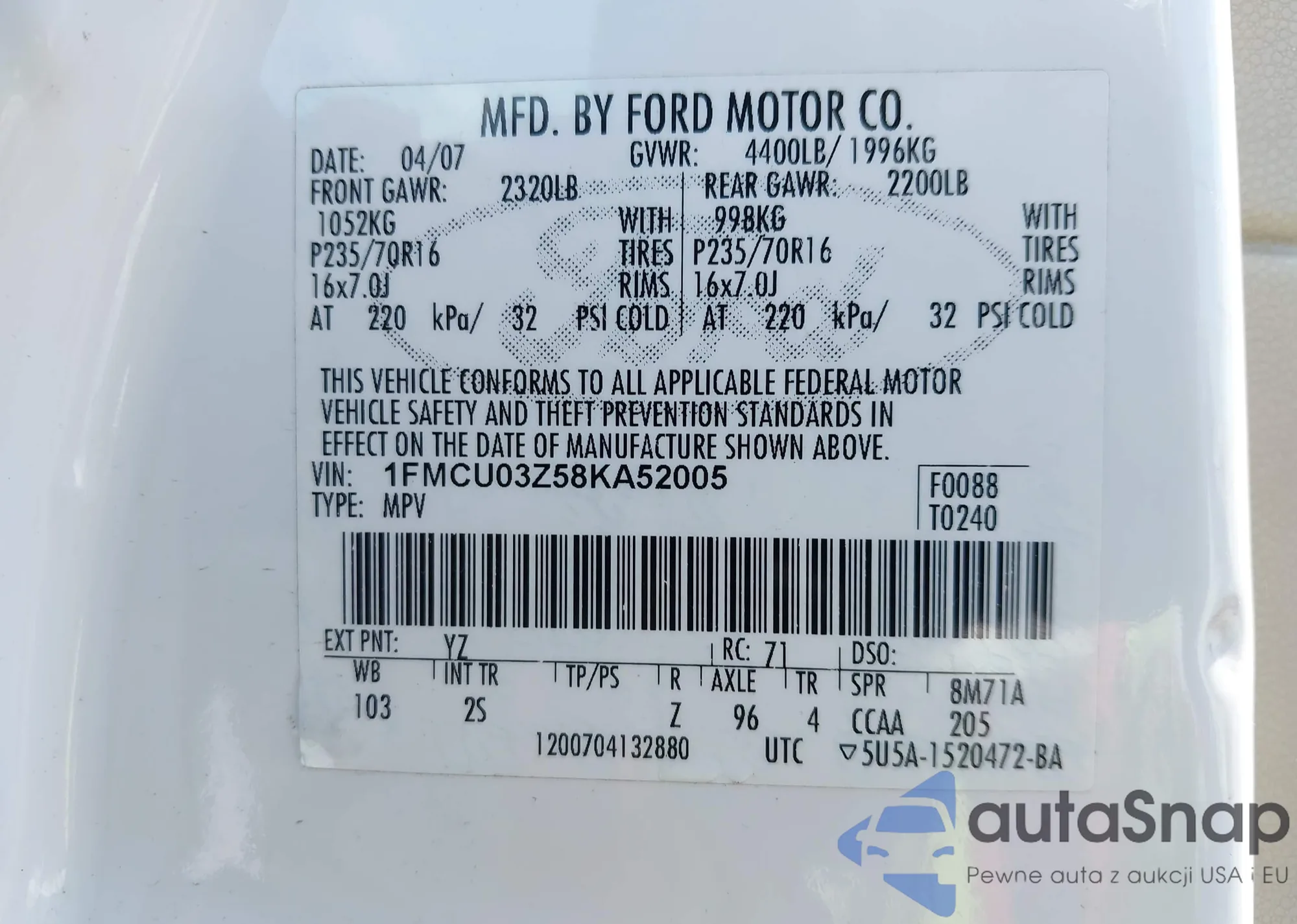 VIN: 1FMCU03Z58KA52005