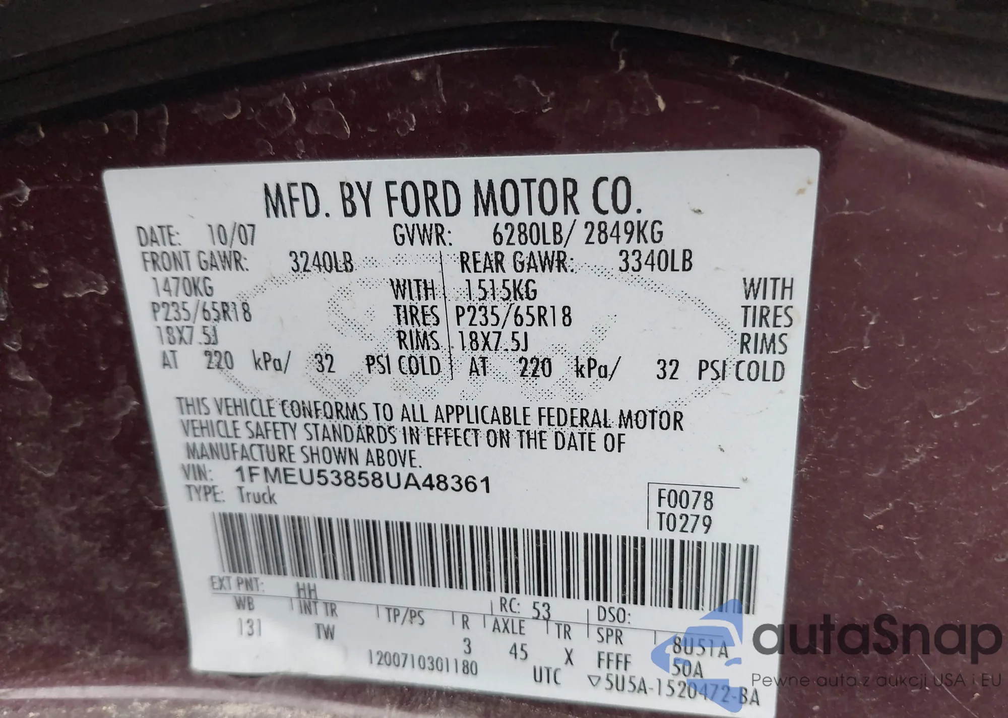 The car Ford Explorer Sport Trac 2008 (VIN 1FMEU53858UA48361) has not been auctioned before. The documents are clean, and the mileage matches or is below the market average. Sold by an insurance company – we recommend purchase. Delivery to the port will take approx. 6–8 weeks.