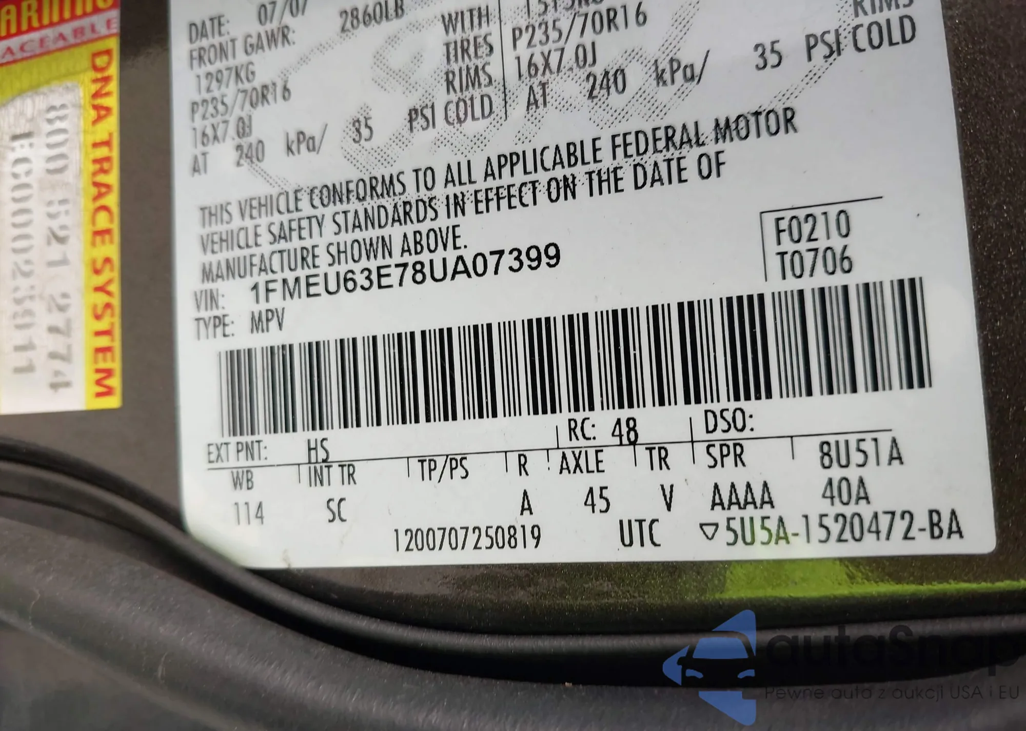 The car Ford Explorer 2008 (VIN 1FMEU63E78UA07399) has not been auctioned before. The documents are clean, and the mileage matches or is below the market average. Sold by an insurance company – we recommend purchase. Delivery to the port will take approx. 6–8 weeks.