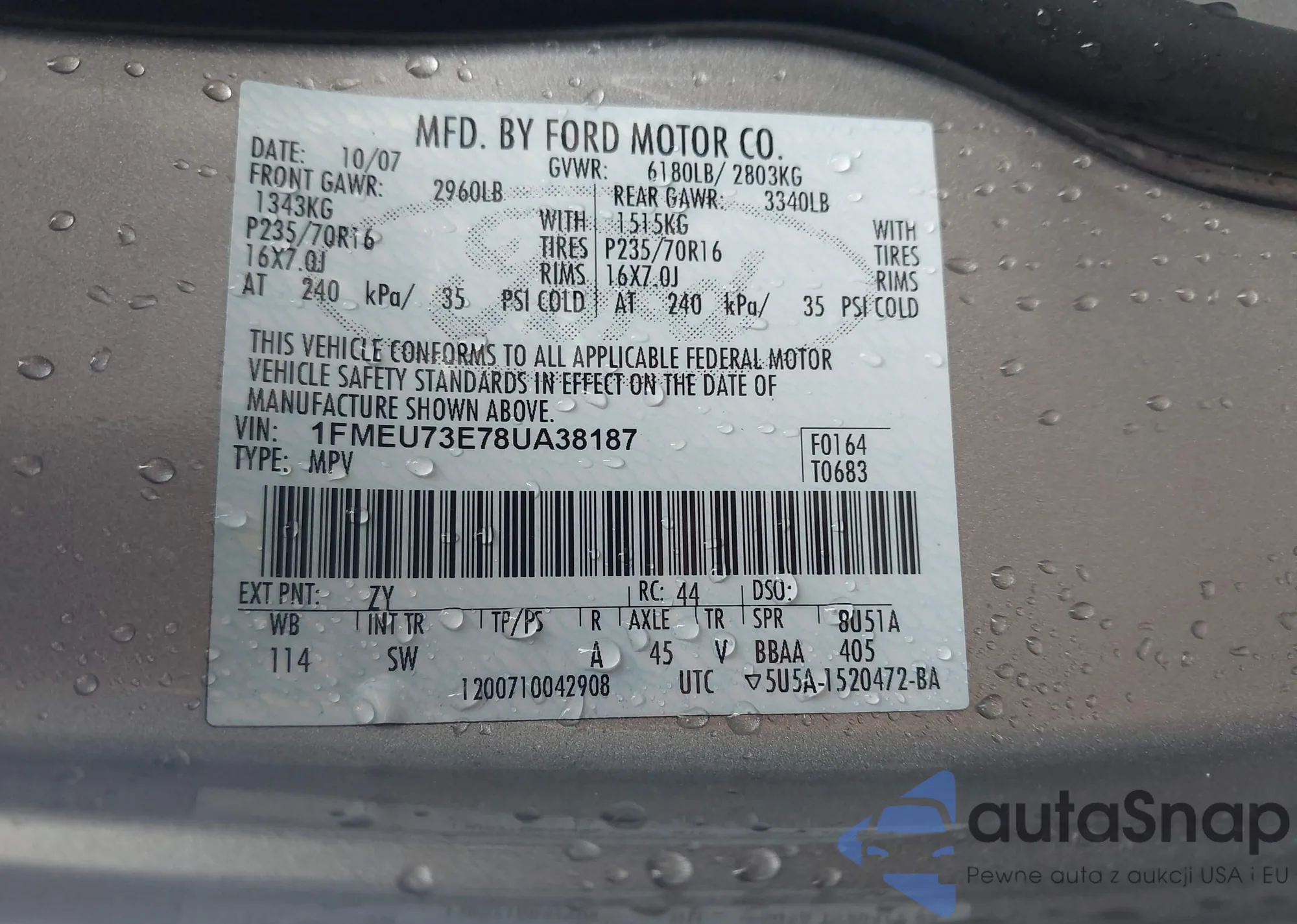 The car Ford Explorer 2008 (VIN 1FMEU73E78UA38187) has not been auctioned before. The documents are clean, and the mileage matches or is below the market average. Sold by an insurance company – we recommend purchase. Delivery to the port will take approx. 6–8 weeks.