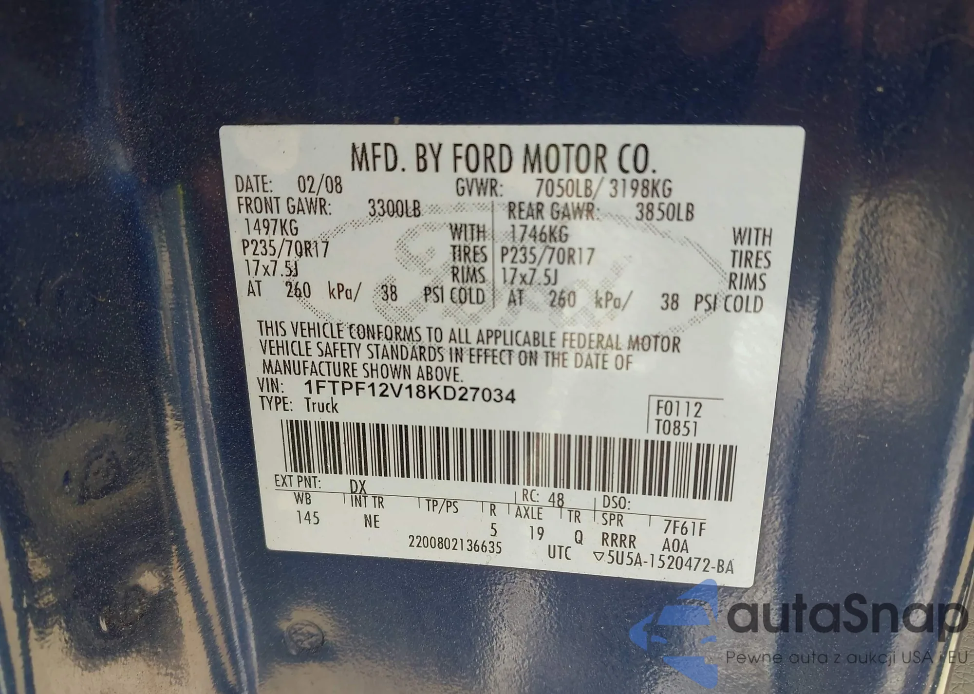 The car Ford F-150 2008 (VIN 1FTPF12V18KD27034) has not been auctioned before. The documents are clean, and the mileage matches or is below the market average. Sold by an insurance company – we recommend purchase. Delivery to the port will take approx. 6–8 weeks.