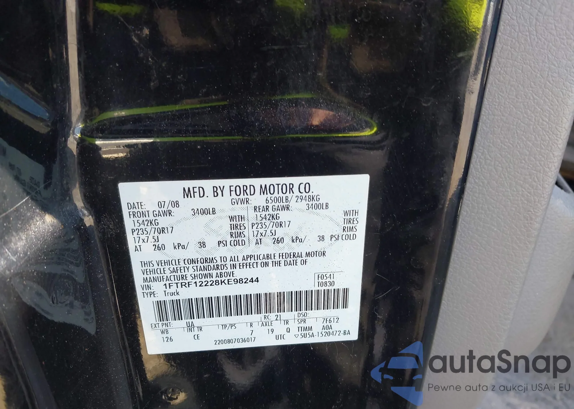 The car Ford F-150 2008 (VIN 1FTRF12228KE98244) has not been auctioned before. The documents are clean, and the mileage matches or is below the market average. Sold by an insurance company – we recommend purchase. Delivery to the port will take approx. 6–8 weeks.