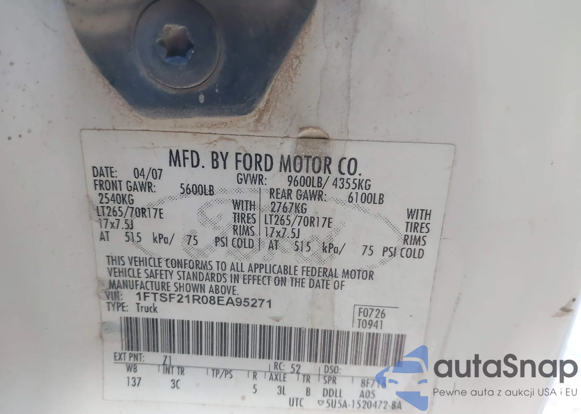 The car Ford F250 2008 (VIN 1FTSF21R08EA95271) has not been auctioned before. The documents are clean, and the mileage matches or is below the market average. Sold by an insurance company – we recommend purchase. Delivery to the port will take approx. 6–8 weeks.
