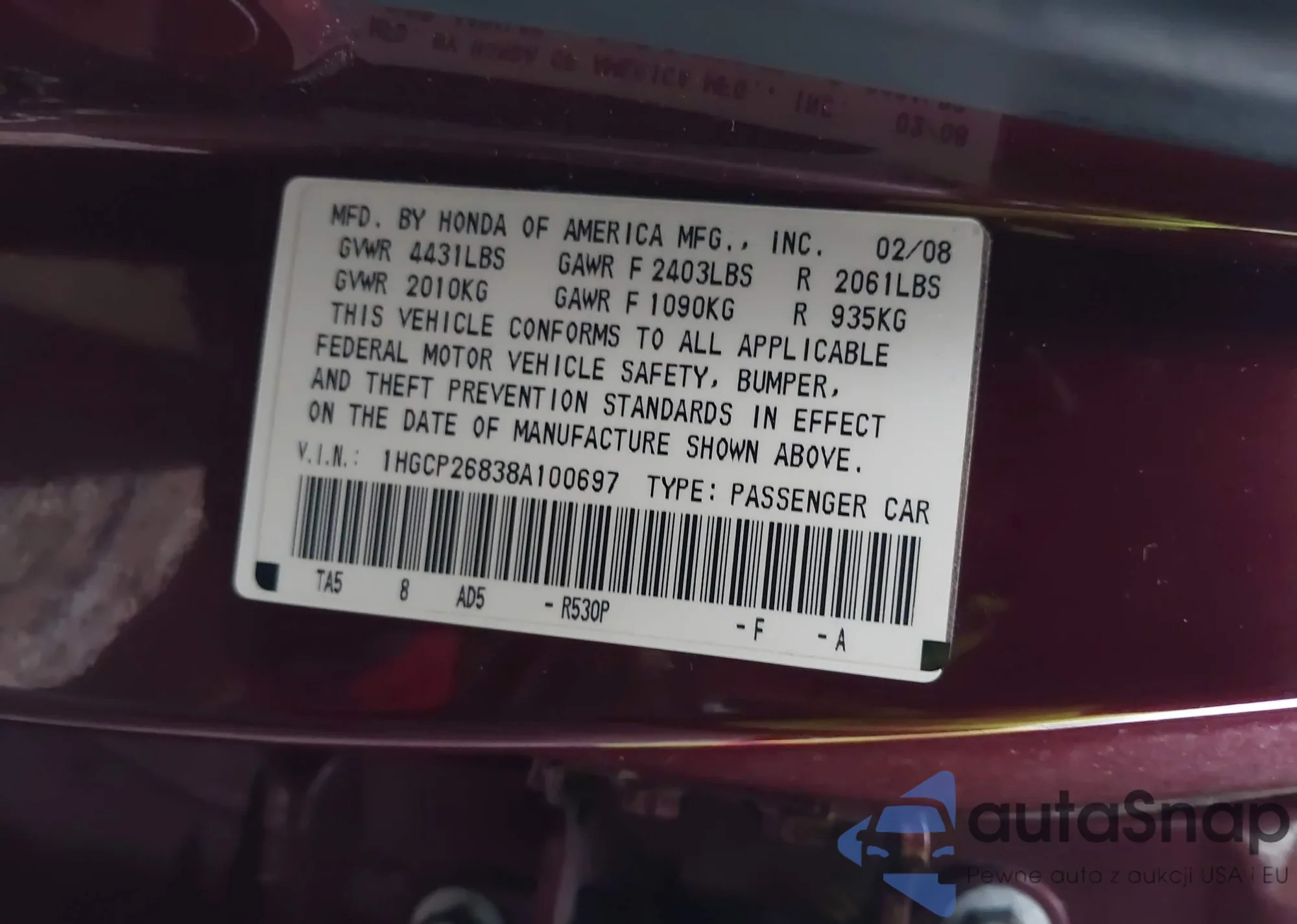 VIN: 1HGCP26838A100697
