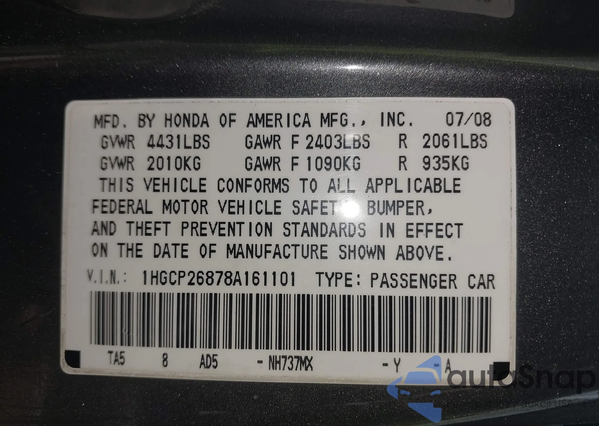 VIN: 1HGCP26878A161101